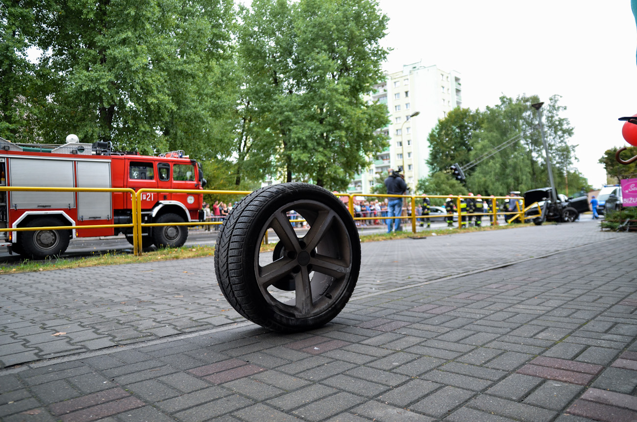 O ogromnej prędkości uciekającego może świadczyć koło, które po zderzeniu oderwało się od pojazdu i powędrowało kilkanaście metrów dalej. Złodziej to 21-letni mieszkaniec Szczecina.