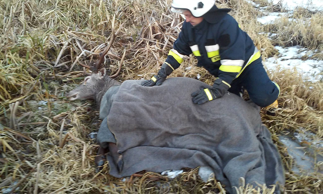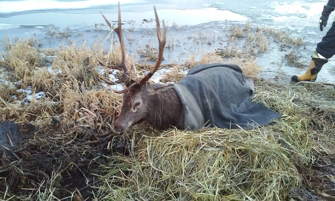 Strażacy wykłuli lód, aby zwierzęciu było łatwiej wyjść na brzeg, następnie przymocowali liny do poroża jelenia i pomogli mu wydostać się z rzeki.  – Ważył około 350 kg. Był cały sztywny, nie stawiał żadnego oporu, tylko dyszał. Położyliśmy go na wyłożonych wcześniej snopkach siana na ziemię i okryliśmy go kocami oraz sianem. Obok rozpaliliśmy ognisko, by było mu ciepło – mówi Bartosz Załachowski, dowódca akcji.