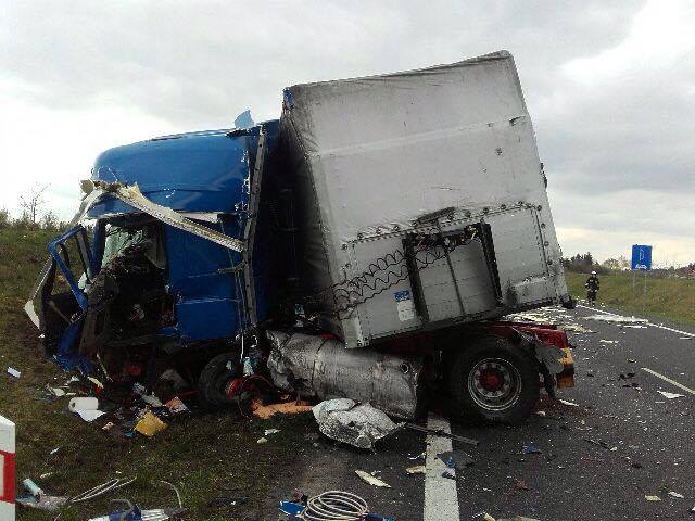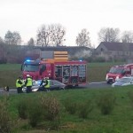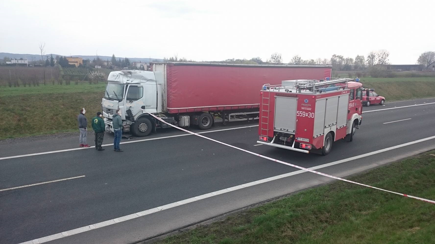 Do zdarzenia natychmiast zadysponowano dwie jednostki OSP oraz zastęp z JRG2, Zespoły Ratownictwa Medycznego i policję. Po dojeździe na miejsce okazało się, że zderzyły się trzy pojazdy: samochód dostawczy i dwa ciągniki siodłowe z naczepą. Działania strażaków polegały na zabezpieczeniu miejsca zdarzenia, uzyskaniu dostępu do osób poszkodowanych, odłączenia zasilania w pojazdach i neutralizacji płynów eksploatacyjnych.