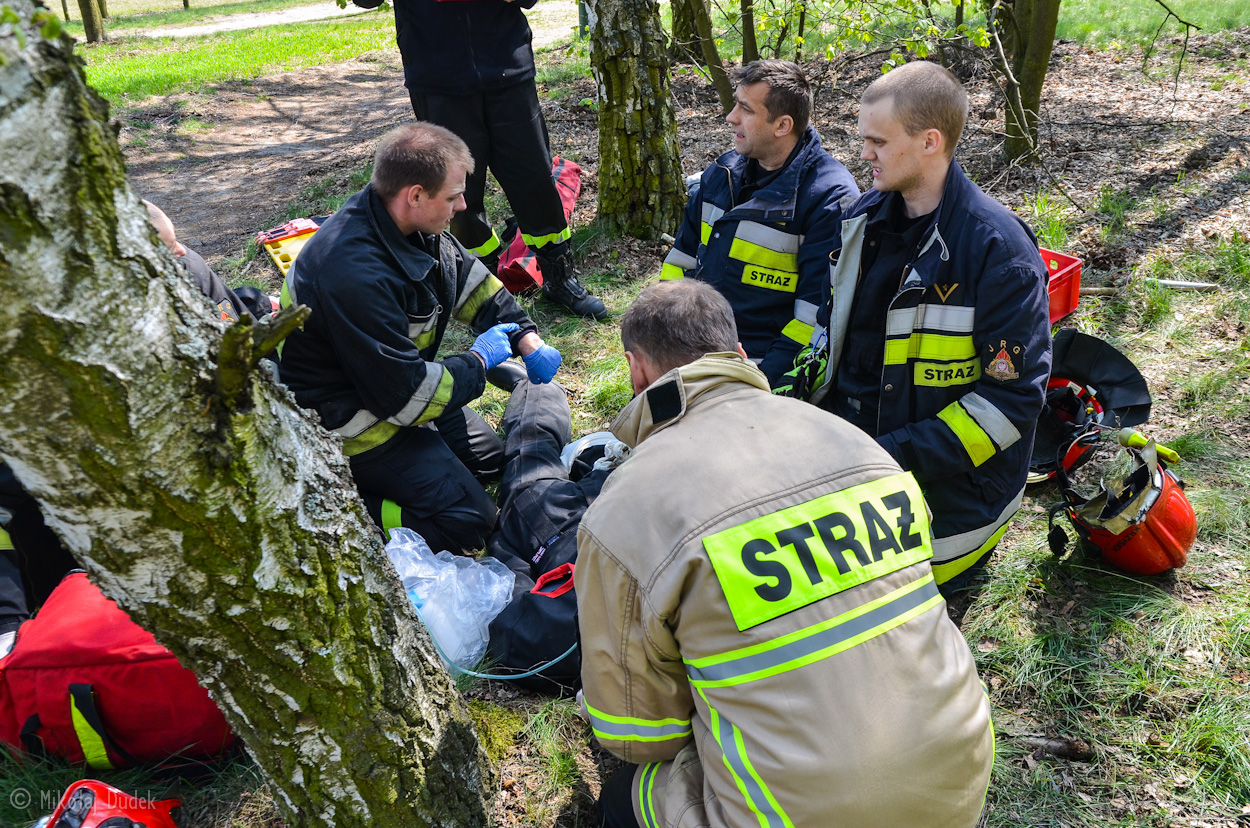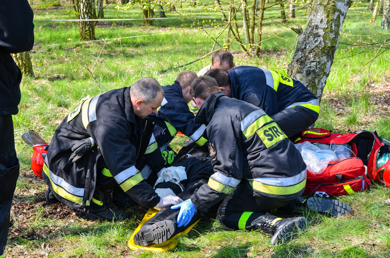 Scenka 4: Mężczyzna w wieku 60-lat przycinał na wysokości gałęzie pilarką łańcuchową, w wyniku wypadku doszło do amputacji kończyny dolnej oraz wstrząsu hipowolemicznego.