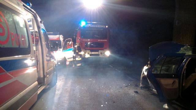 Około 21.20 do SKKP w Pile wpływa zgłoszenie o kolejnym wypadku, tym razem na drodze Jabłonowo – Kruszewo. Do zdarzenia zadysponowano JRG 1 oraz OSP Kruszewo, ZRM i policję. – Według informacji przekazanych nam przez dyspozytora, pojazd osobowy uderzył w drzewo i w środku są zakleszczone osoby – piszą ochotnicy z Kruszewa. Po dojeździe na miejsce zdarzenia rozpoznano, że 4 osoby, w tym dwójka dzieci z pomocą świadków zdarzenia opuściły pojazd, lecz wymagali interwencji medycznej. Ratownicy z OSP Kruszewo udzielili im kwalifikowanej pierwszej pomocy przed przyjazdem ZRM. Działania polegały także na zabezpieczeniu miejsca zdarzenia, odłączeniu akumulatora, kierowaniu ruchem. Poszkodowani z ogólnymi obrażeniami zostali przetransportowani do szpitala. Przyczyną zajścia prawdopodobnie było wtargnięcie na jezdnię osoby nietrzeźwej. Cała sprawę bada policja. Działania zakończono około północy.