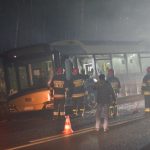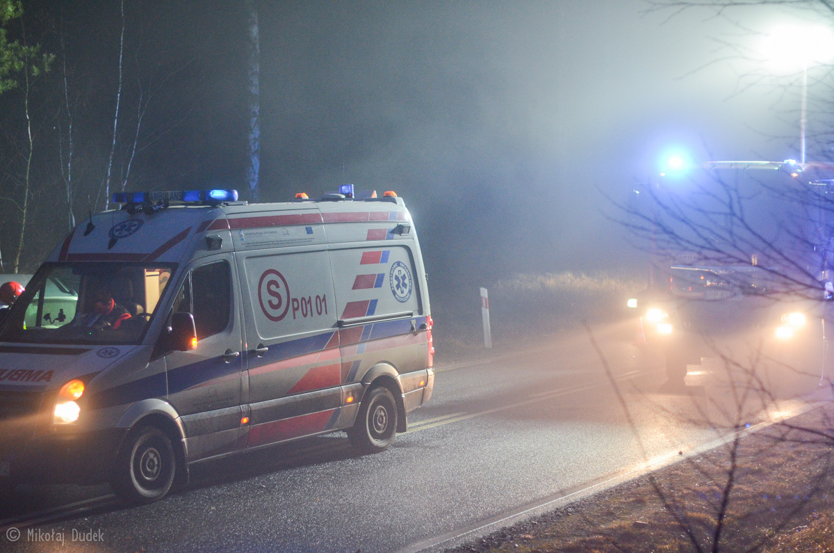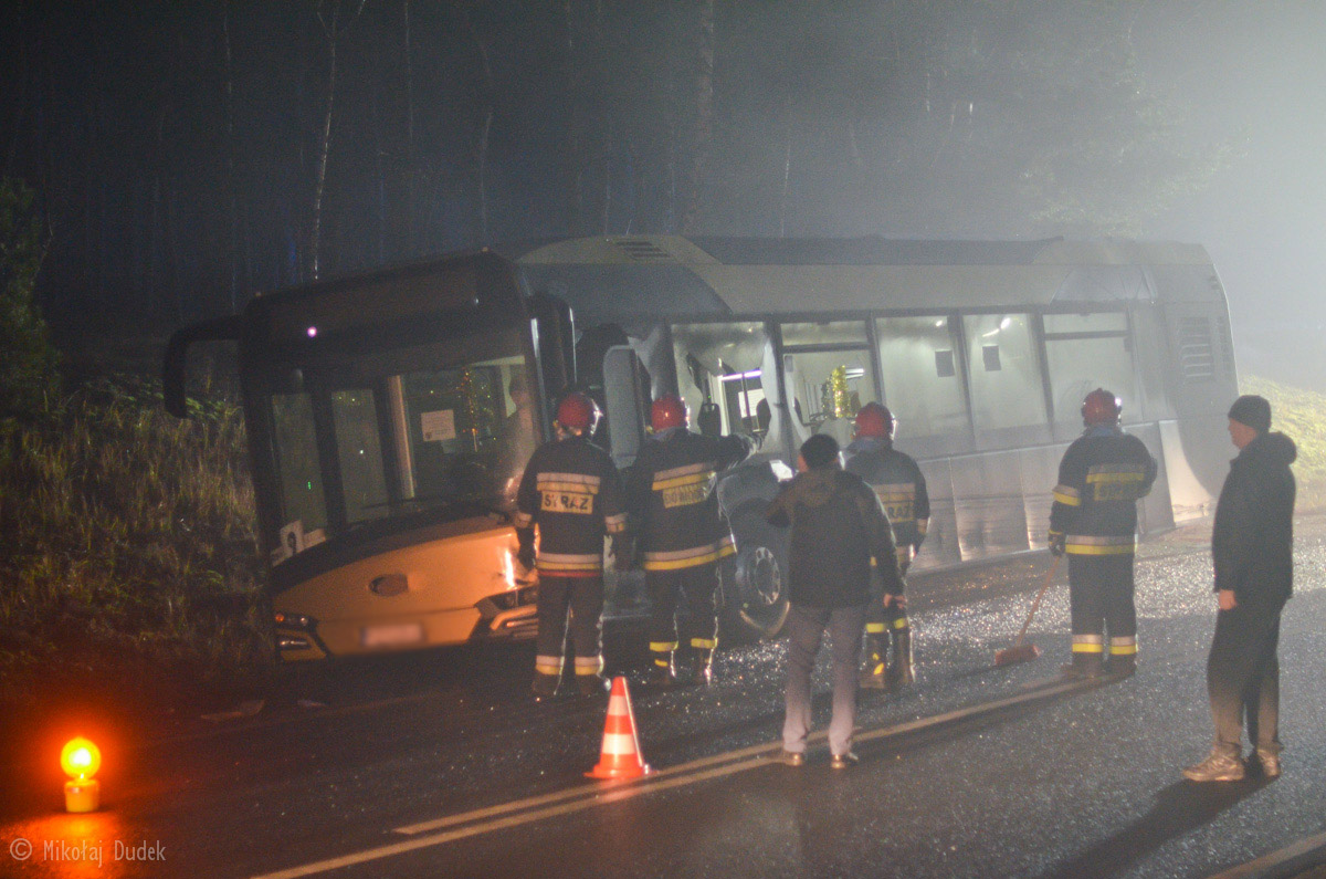 Po przybyciu na miejsce zdarzenia pierwszych zastępów rozpoznano, że kierowca samochodu osobowego z nieustalonych przyczyn zjechał na przeciwległy pas ruchu doprowadzając do zderzenia z jadącym prawidłowo autobusem. W wyniku zderzenia kierujący Toyotą został uwięziony w pojeździe. Działania strażaków polegały na zabezpieczeniu i oświetleniu miejsca zdarzenia, odłączeniu akumulatorów oraz wykonaniu dostępu do osoby poszkodowanej przy użyciu narzędzi hydraulicznych i ewakuacji jej z pojazdu. Autobusem podróżowały 4 osoby, które jak się okazało po przebadaniu przez lekarza, nie wymagały hospitalizacji. Kierowcę pojazdu osobowego z ogólnymi obrażeniami przetransportowano do szpitala.