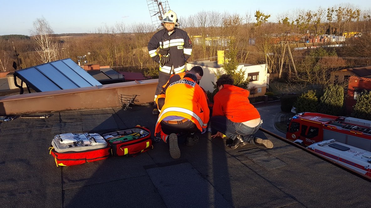 Kwadrans przed godziną 17. do dyżurnego SKKP PSP w Pile wpłynęło zgłoszenie dotyczące pomocy Zespołowi Ratownictwa Medycznego w ewakuacji mężczyzny z dachu. Do akcji zadysponowano dwa zastępy OSP z Wyrzyska oraz dwa zastępy, w tym podnośnik z JRG 2 w Pile.