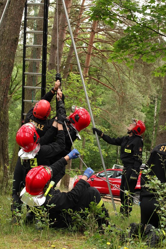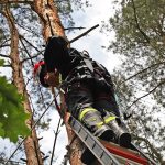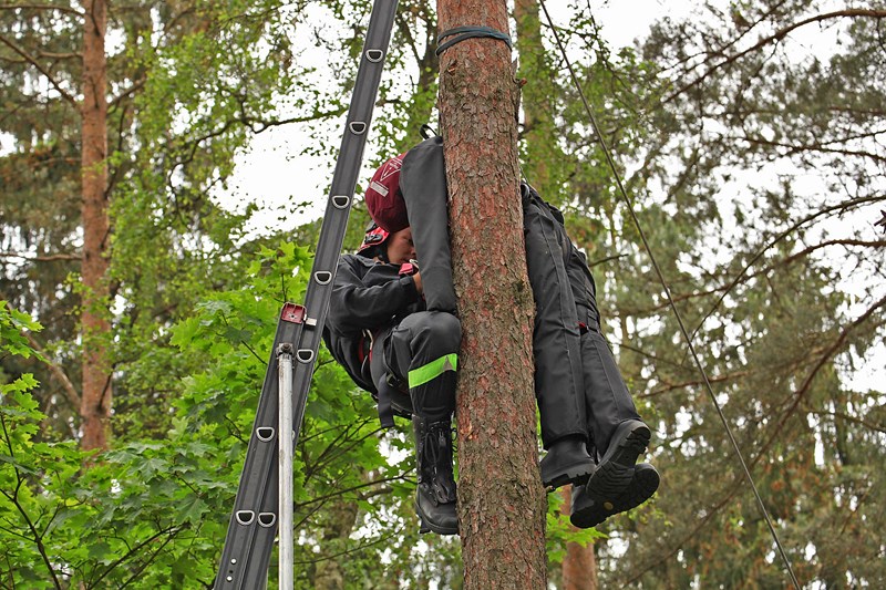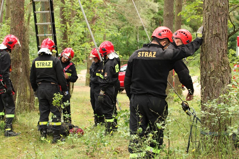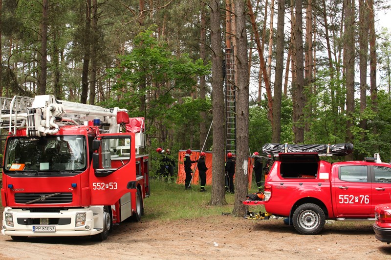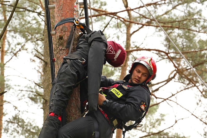 Bezpośrednio na wyznaczonych drzewach przeprowadzona została akcja ratownicza paralotniarza, który w wyniku upadku z wysokości uwięziony został na drzewie. Strażacy przy wykorzystaniu drabin, sprzętu specjalistycznego oraz technik linowych ewakuowali bezpiecznie na ziemię osobę poszkodowaną.