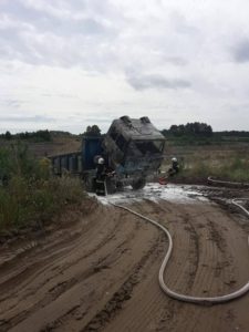 Dnia 4.08.2017r. o godzinie 11:33 w rozległ się dźwięk syreny alarmowej. Dyżurny SKKP PSP w Pile zadysponował OSP Kruszewo do pożaru na żwirowni w miejscowości Mirosław. Do działań wyruszyły dwa zastępy. Po dojeździe na miejsce zdarzenia okazało się, że pali się samochód ciężarowy przewożący piach. Dzięki przytomnej reakcji kierowcy, który odchylił kabinę udało się nie dopuścić do przeniesienia pożaru na komorę silnika. Na miejsce dojechał także jeden zastęp z JRG 1 PSP Piła. Po niecałych dwóch godzinach wróciliśmy do jednostki.