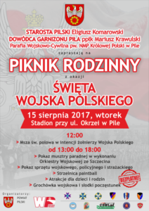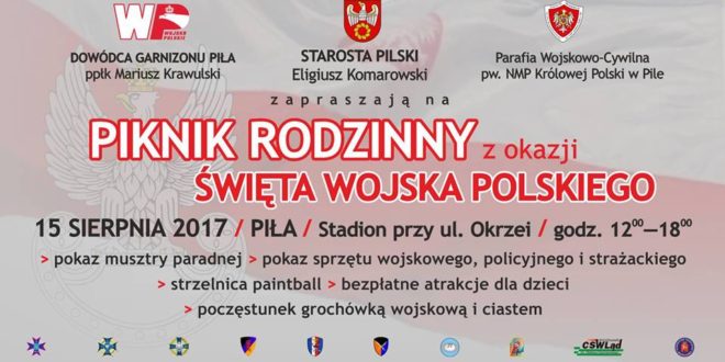 15 sierpnia na stadionie przy ul. Okrzei w Pile odbędzie się piknik rodzinny z okazji Święta Wojska Polskiego. Starosta Pilski Eligiusz Komarowski wraz z Dowódcą Garnizonu Piła ppłk. Mariuszem Krawulskim oraz Parafią Wojskowo – Cywilną pw. NMP Królowej Polski w Pile serdecznie zapraszają pilan i mieszkańców powiatu pilskiego. Tego dnia Wojsko Polskie będzie reprezentowane przez kilkanaście jednostek, które dotrą do Piły ze specjalistycznym sprzętem.
