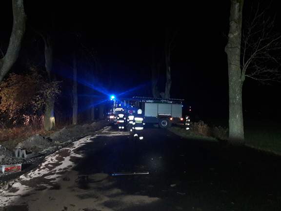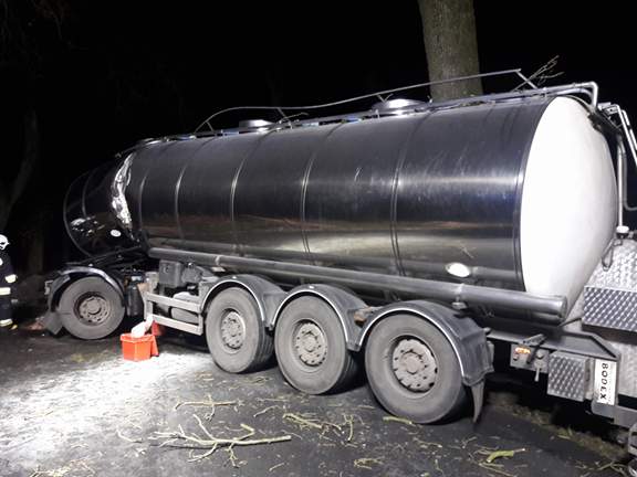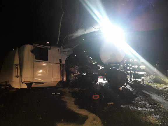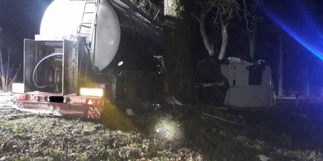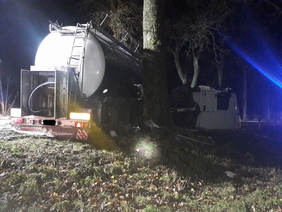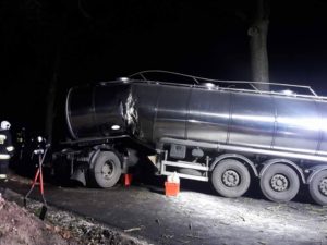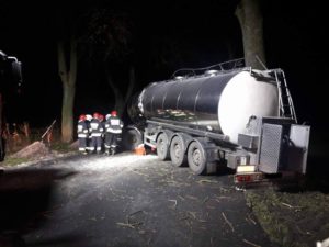 W dniu dzisiejszym (06.11.2017) około godziny 18:15 doszło do wypadku drogowego z udziałem samochodu ciężarowego przewożącego mleko na drodze wojewódzkiej nr 179 przed miejscowością Nowy Dwór. Pojazd uderzył w drzewo.