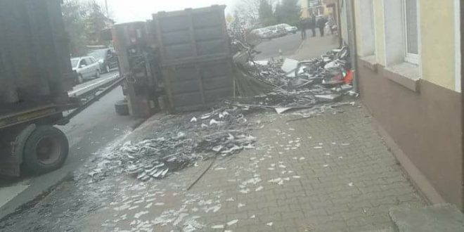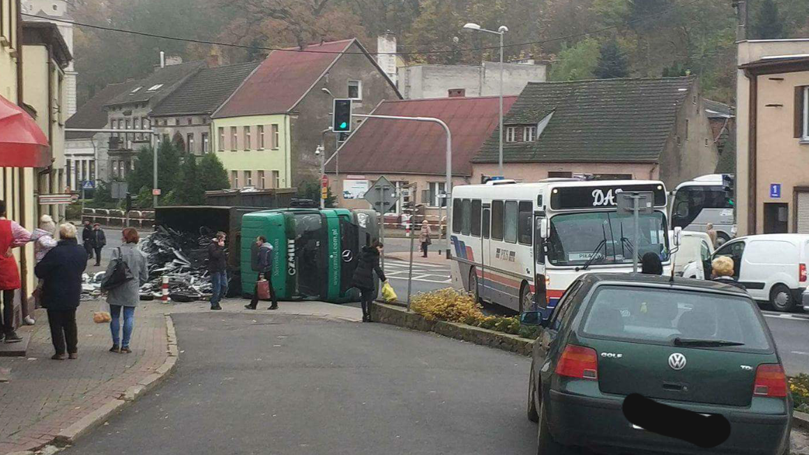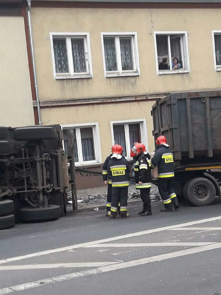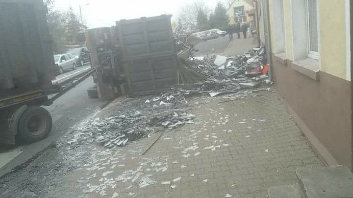 Na krzyżowce Drogi Krajowej nr 11 z ulicą Pilską przewrócił się samochód ciężarowy przewożący złom.