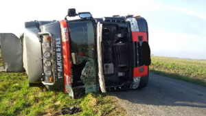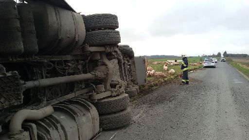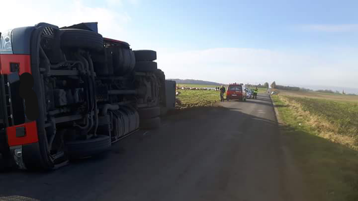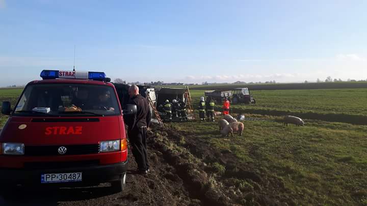Z nieznanych dotąd przyczyn przewróciła się ciężarówka przewożąca trzodę chlewną.