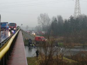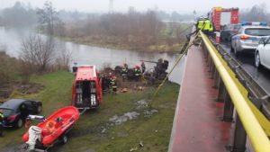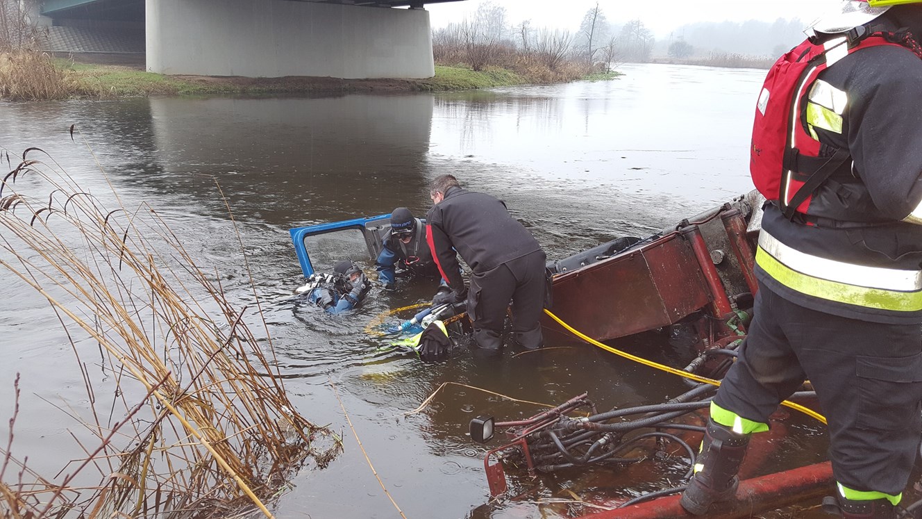 Nieprzytomny kierowca pojazdu jest zakleszczony w kabinie, nurkowie zabezpieczyli go w źródło powietrza. Trwają działania ze sprzętem hydraulicznym mające na celu uwolnienie poszkodowanego kierowcy. Informuje Rzecznik KP PSP w Pile mł.bryg. Zbigniew Szukajło