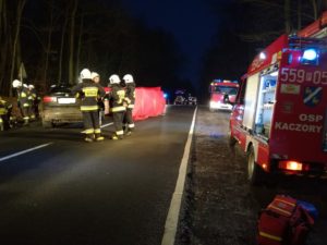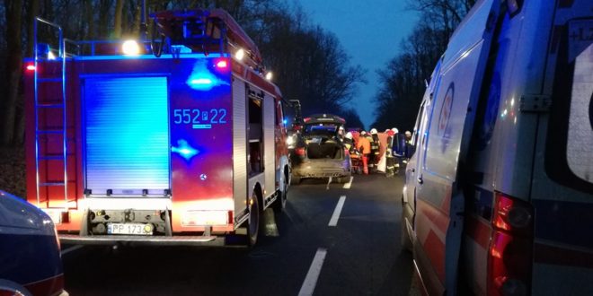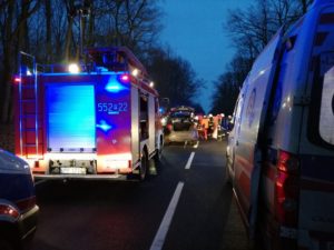 W wyniku zderzenia czołowego dwóch pojazdów (BMW, Hyundai) obrażenia poniosły 4 osóby. Jedna osoba wymagała przeprowadzenia RKO. Niestety po przeprowadzonej akcji reanimacyjnej lekarz będący na miejscu stwierdził zgon 74 latki.