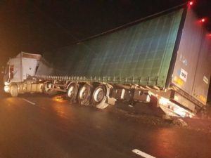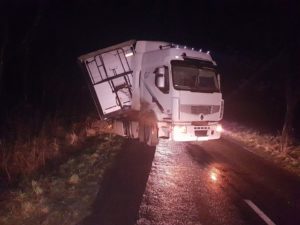 Do kolejnego zdarzenia dzisiejszego wieczoru doszło ok godz 22:00. Pojazd ciężarowy jadący drogą Białośliwie – Nieżychowo z nieustalonych dotąd przyczyn zjechał z jezdni zostawiając naczepę w przydrożnym rowie. Na szczęście tym razem bez osób poszkodowanych.
