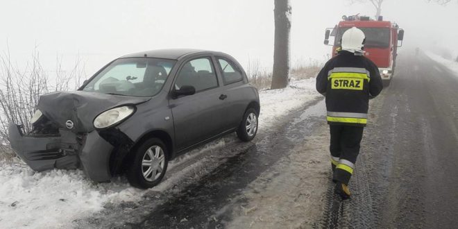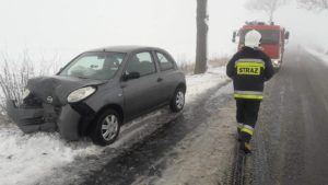 Pierwsze zdarzenie miało miejsce na drodze Szydłowo-Skrzatusz około godziny 9 rano. Po dojeździe na miejsce zdarzenia zastępu z OSP Szydłowo, okazało się, iż w wyniku wpadnięcia w poślizg samochód marki Nissan Micra uderzył w przydrożne drzewo. Kierującej na szczęście nic groźnego się nie stało. Działania strażaków polegały na zabezpieczeniu miejsca zdarzenia, kierowaniu ruchem oraz pomocy przy załadowaniu uszkodzonego samochodu na lawetę.