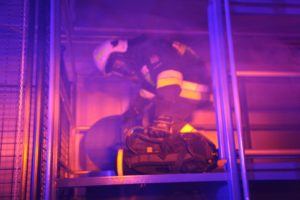 W obu częściach panuje całkowita ciemność i warunki zbliżone do rzeczywistego pożaru wewnętrznego obiektu. Warto przypomnieć, że każdy strażak dopuszczony jest do działaniach ratowniczo – gaśniczych po zaliczeniu testu w komorze dymowej.