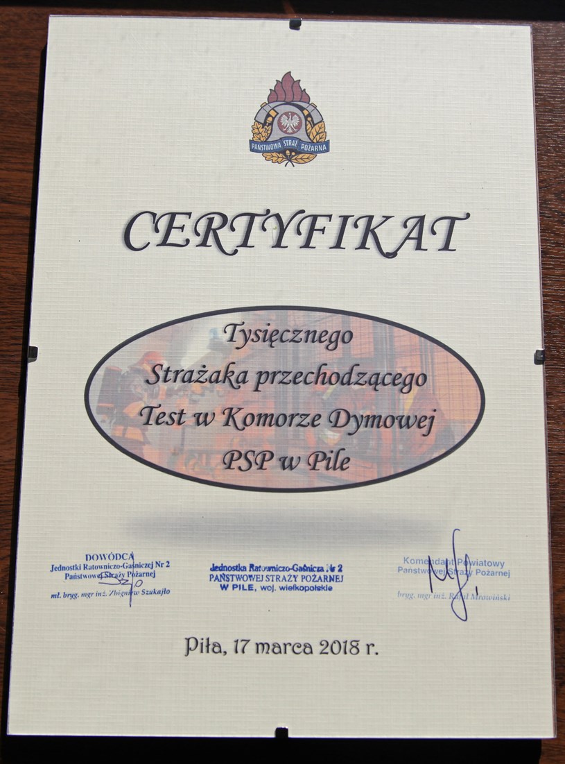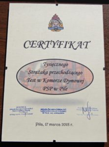 W dniu 17 marca 2018 roku wręczony został symboliczny certyfikat dla strażaka, który ukończył ćwiczenia w pilskiej komorze dymowej z numerem 1000. Okolicznościowy certyfikat otrzymał strażak z OSP Zalesie z powiatu złotowskiego.