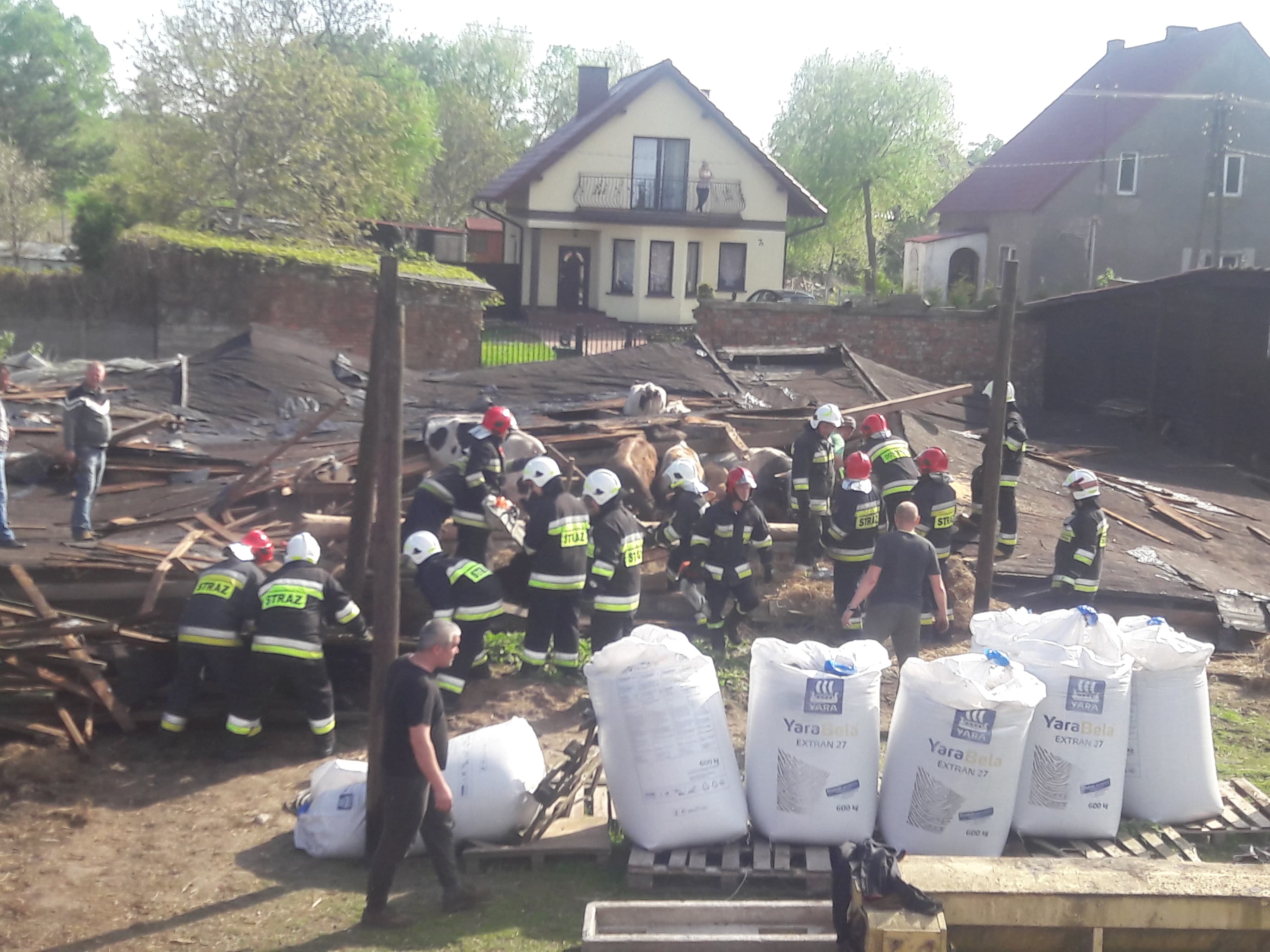 Po godzinie 15:30 jednostka OSP Szydłowo została zadysponowana do zawalonej stodoły w miejscowości Cyk, w której zostało uwięzionych 14 sztuk bydła. Działaniami przybyłych na miejsce zastępów było zabezpieczenie miejsca zdarzenia, wykonaniu dostępu do uwięzionych zwierząt oraz ich ewakuacja poza gruzowisko. Na szczęście – jak informują strażacy z OSP Szydłowo – krowy nie odniosły poważnych obrażeń.