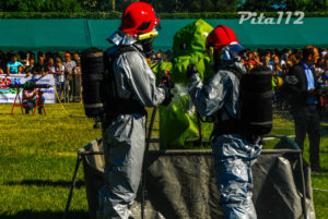 W czasie trwania pokazu zaprezentowano podjęte działania tj. ewakuacje osoby poszkodowanej z zagrożonego terenu, zabezpieczające niebezpieczny wyciek, neutralizacje substancji chemicznej, zabezpieczenie ratowników podejmujących działania w specjalne kombinezony, użycie specjalistycznego sprzętu, pobieranie próbek.