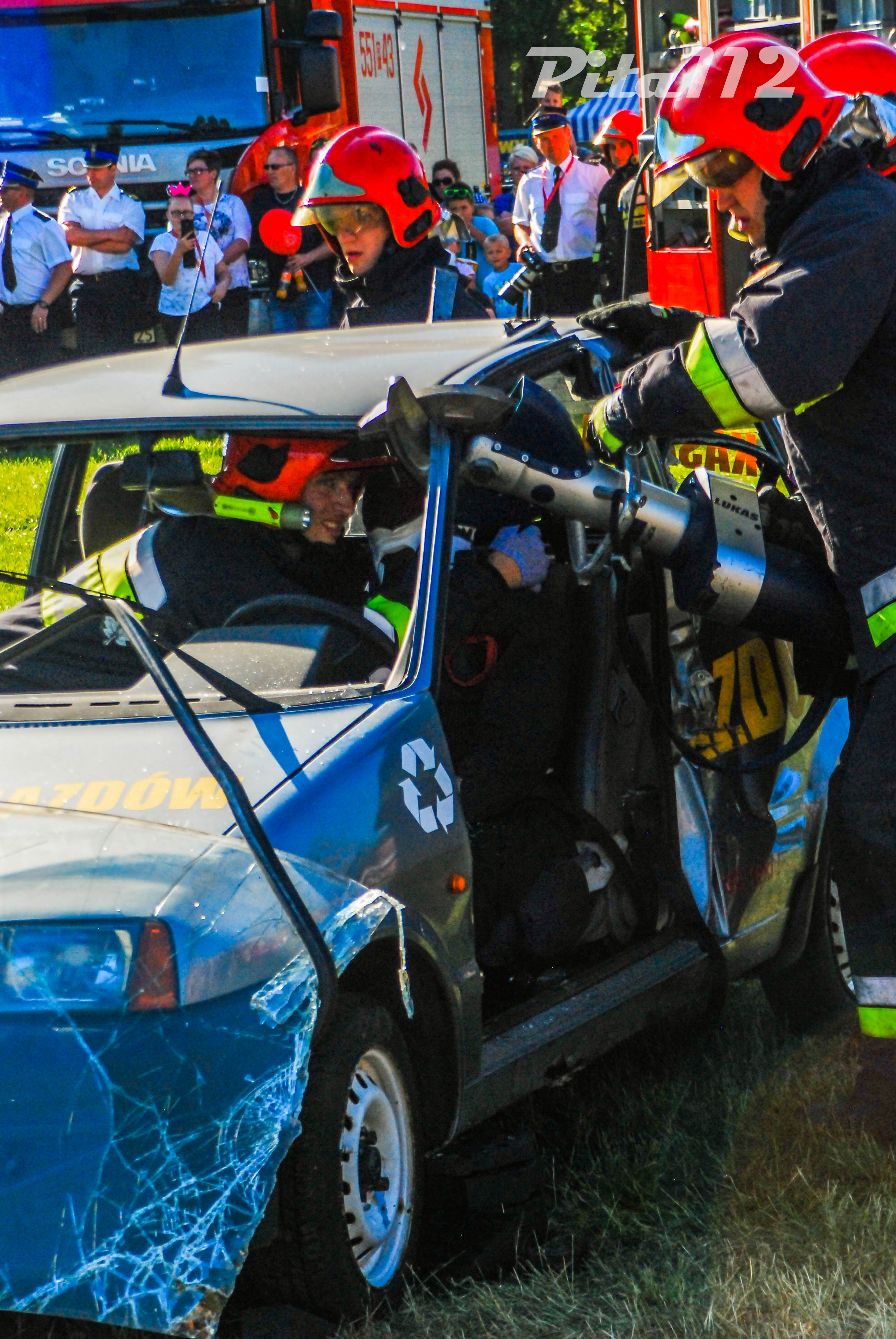 W drugim z pokazów przygotowanym przez strażaków można było zobaczyć jak wygląda akcja ratownicza podczas wypadku drogowego z uwięzionym kierowcą w pojeździe. Po odebraniu zgłoszenia o zaistniałym wypadku na miejsce przybył zastęp techniczny z JRG 1. Na samym początku zabezpieczono teren zdarzenia, jeden z ratowników wyznaczony przez dowódcę wszedł do pojazdu oraz udzielał KPP poszkodowanemu oraz zabezpieczał jego do momentu uwolnienia go przez pozostałych ratowników. Inni strażacy w tym samym czasie aby dostać się do kierowcy otworzyli drzwi za pomocą łomu, wycieli je jak i dach za pomocą sprzętu hydraulicznego po czym uwolniono kierowcę i na desce ortopedycznej ewakuowano go i przekazano ZRM.