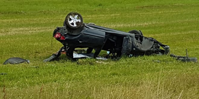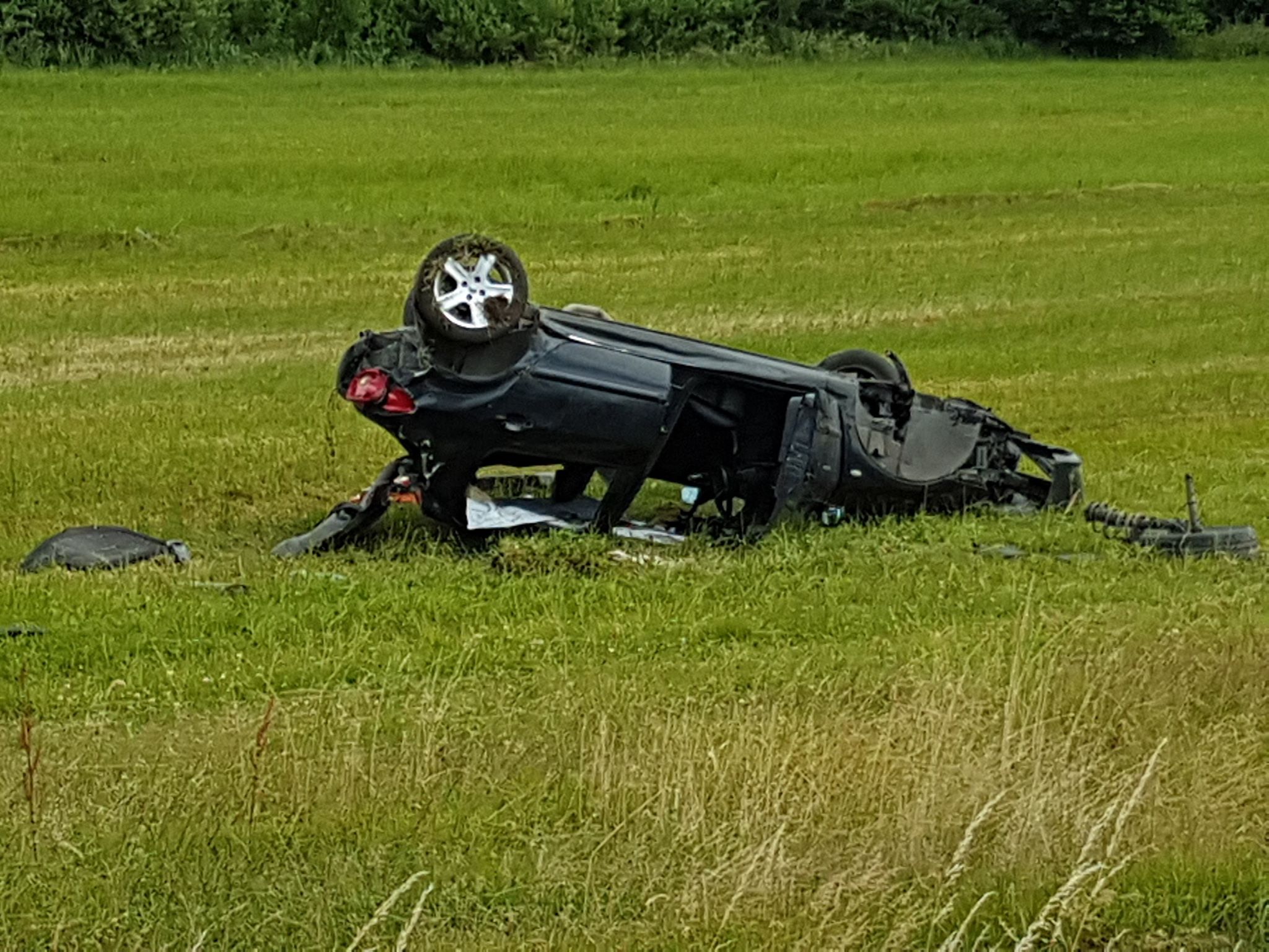 Z nieustalonych dotąd przyczyn auto wypadło z drogi po czym dachowało w polu. Jedna osoba z lekkimi obrażeniami została przetransportowana przez ZRM do szpitala.