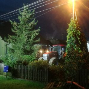 Po dojeździe na miejsce pierwszych jednostek i rozpoznaniu okazało się, iż doszło do pożaru garażu wraz z pomieszczeniem gospodarczym. W środku znajdował się piec oraz składowisko trocin i zboża. Od razu przystąpiono do zlokalizowania źródła ognia i gaszenia pożaru. W tym samym czasie budowana była linia zasilająca w wodę z pobliskiego hydrantu.