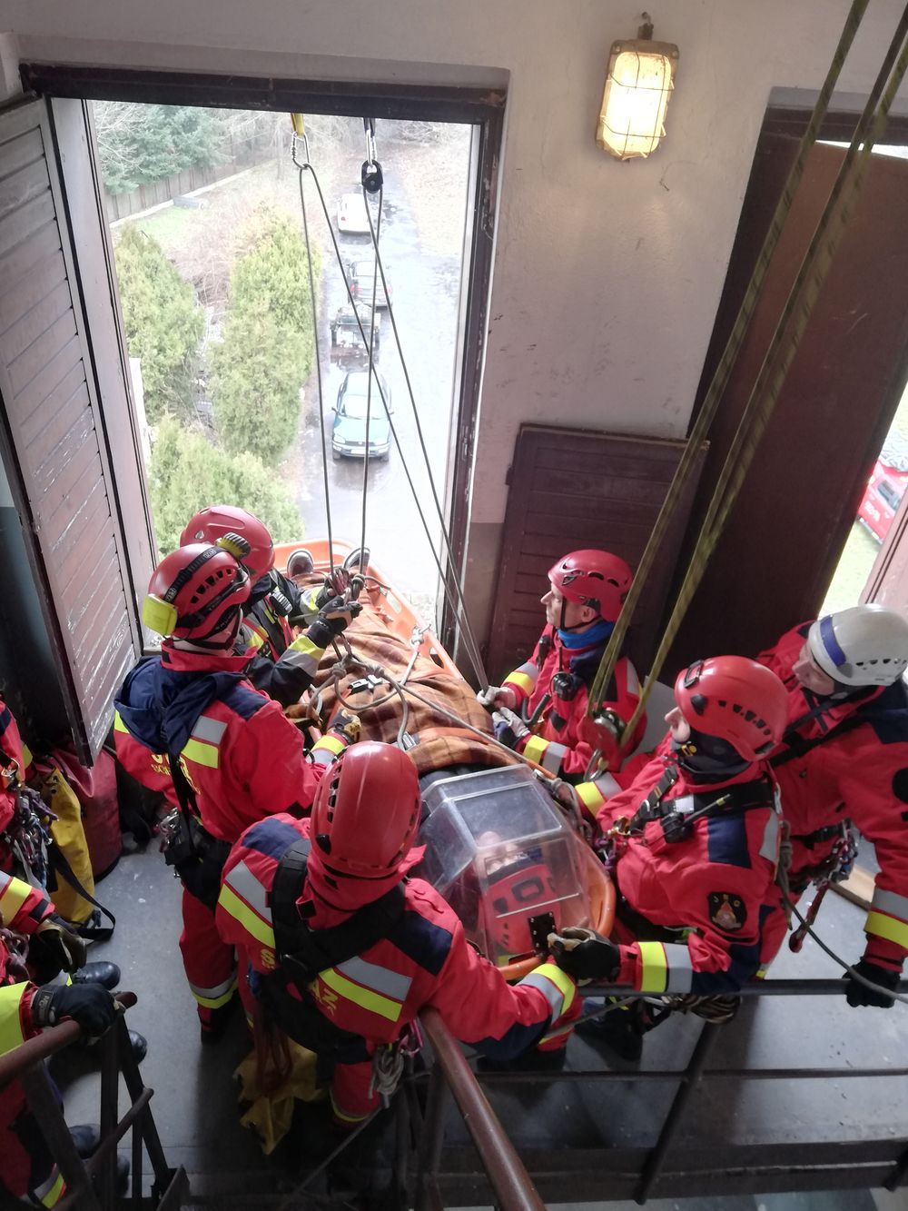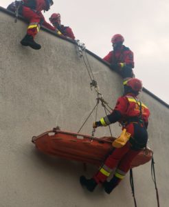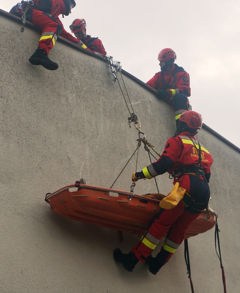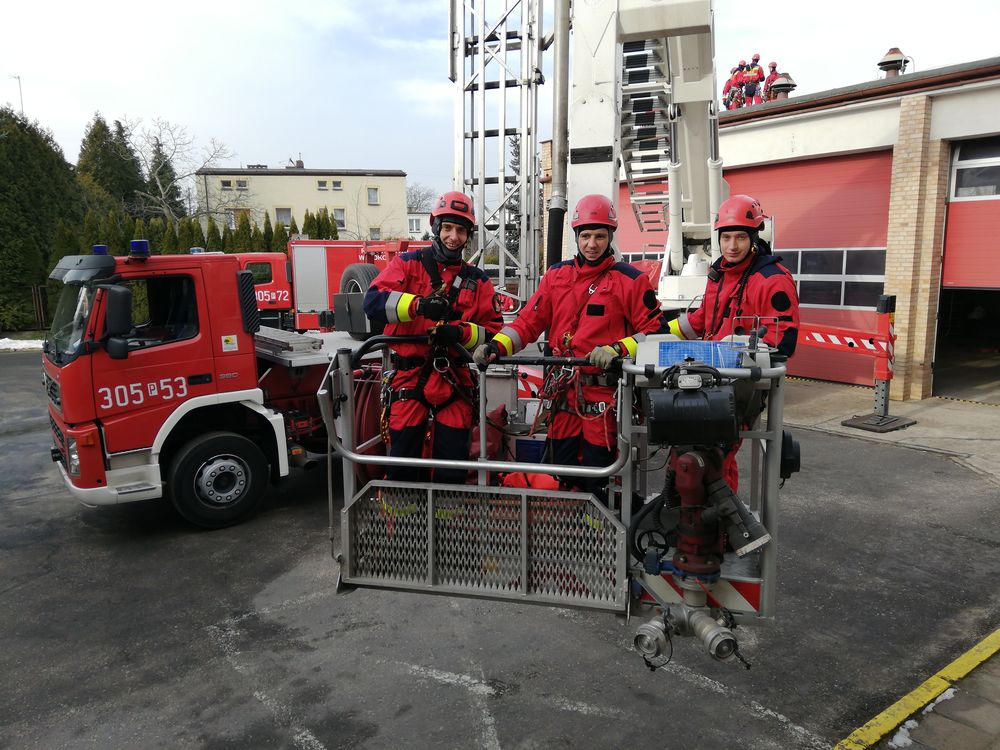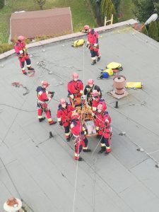 Część praktyczna, zrealizowana na obiektach jednostki ratowniczej, dotyczyła akcji ratownictwa wysokościowego w miejscach trudno dostępnych.