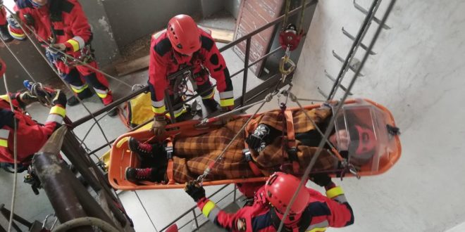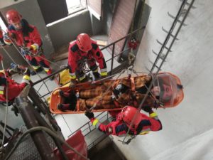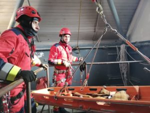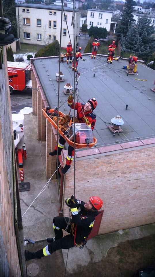 Strażacy ćwiczyli metody ewakuacji osoby z głębokości a następnie transport osoby poszkodowanej w miejsce bezpieczne przy użyciu technik linowych.