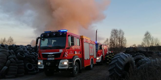 W dniu dzisiejszy(02.03.2019) przed godziną 4 w miejscowości Kłębowiec(gm. Wałcz) wybuchł pożar na składowisku opon.