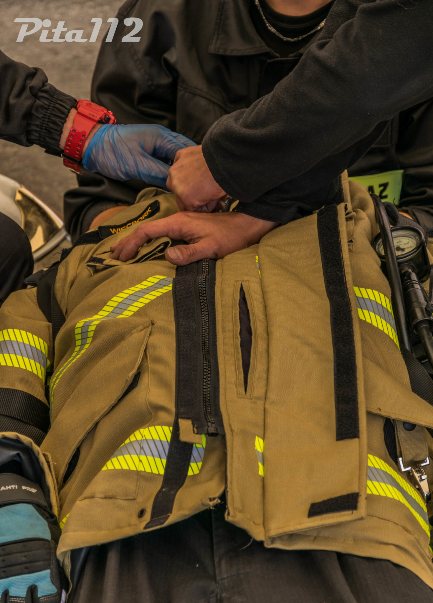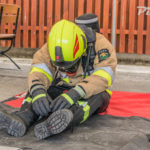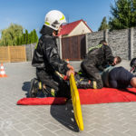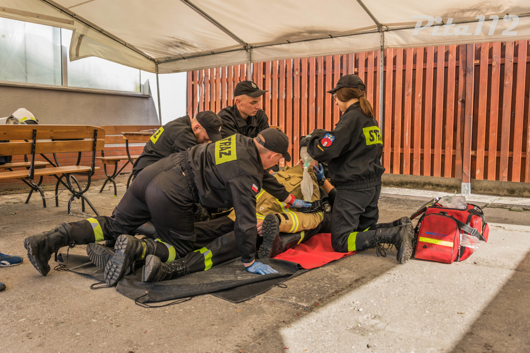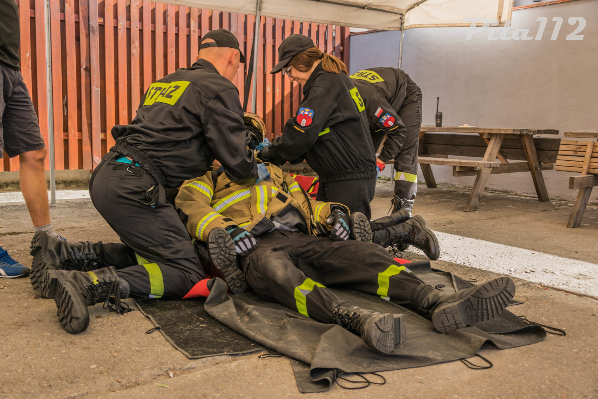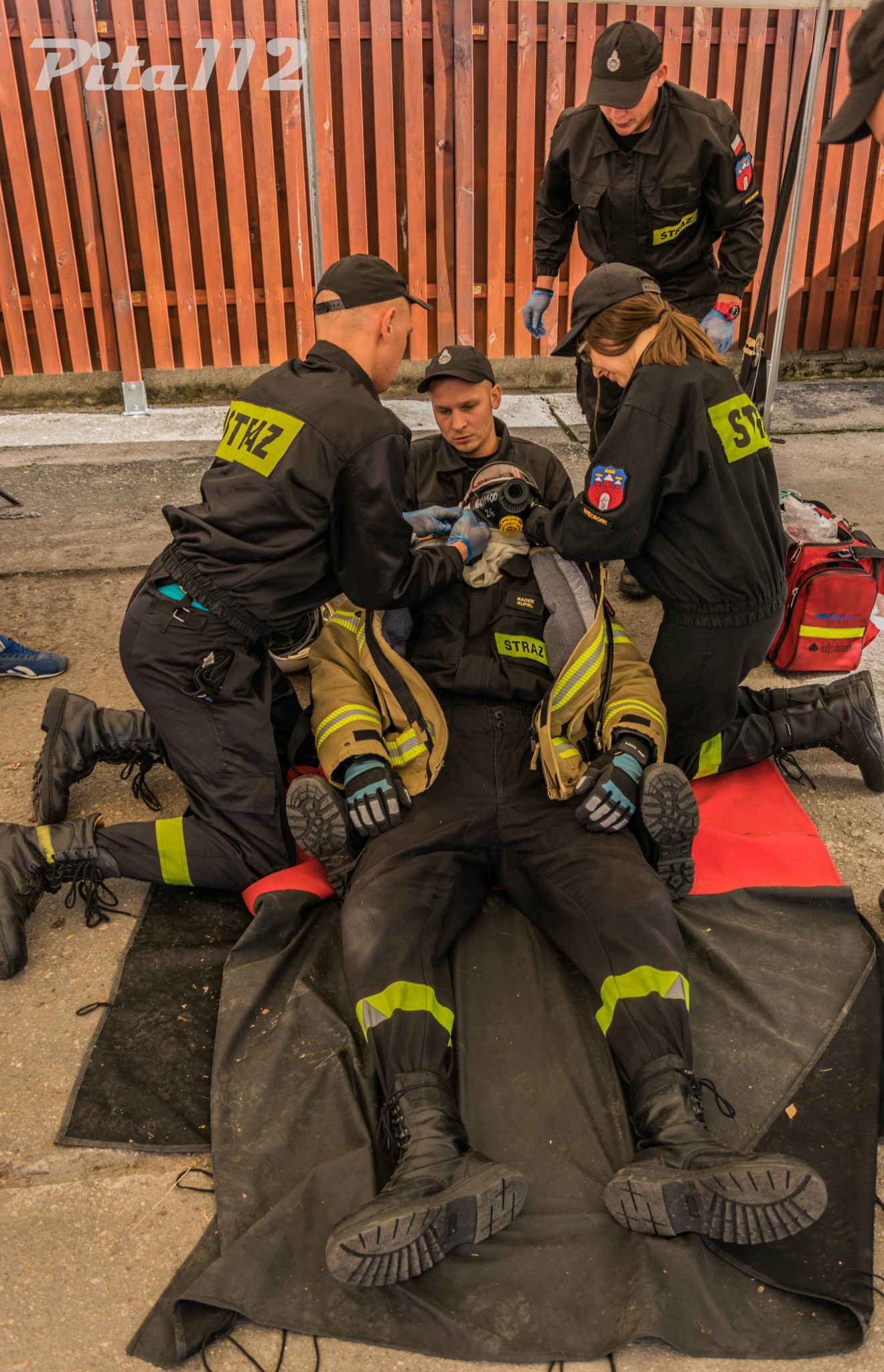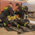 Scenka nr. 5 – Strażak w pełnym umundurowaniu wyciągnięty z pożaru, brak funkcji życiowych. Jak najszybsze wdrożenie RKO i rozebrania z ODO, maski, nomexu.