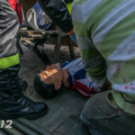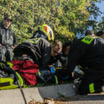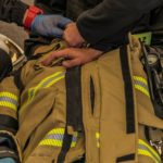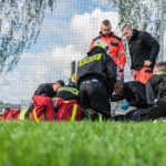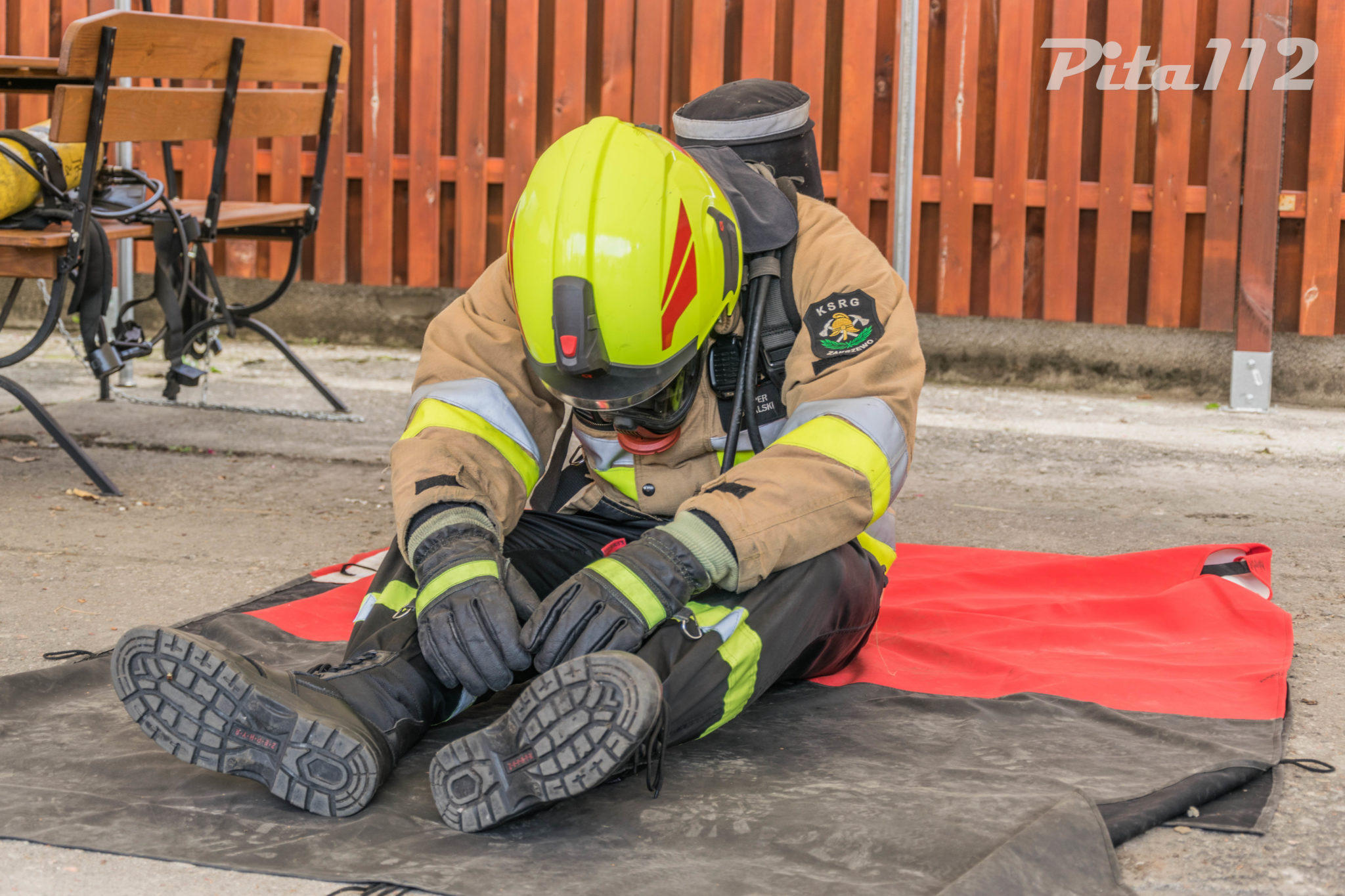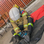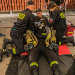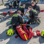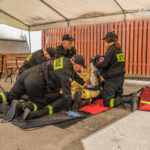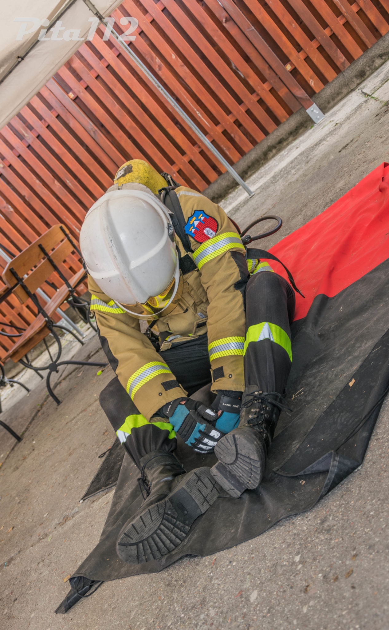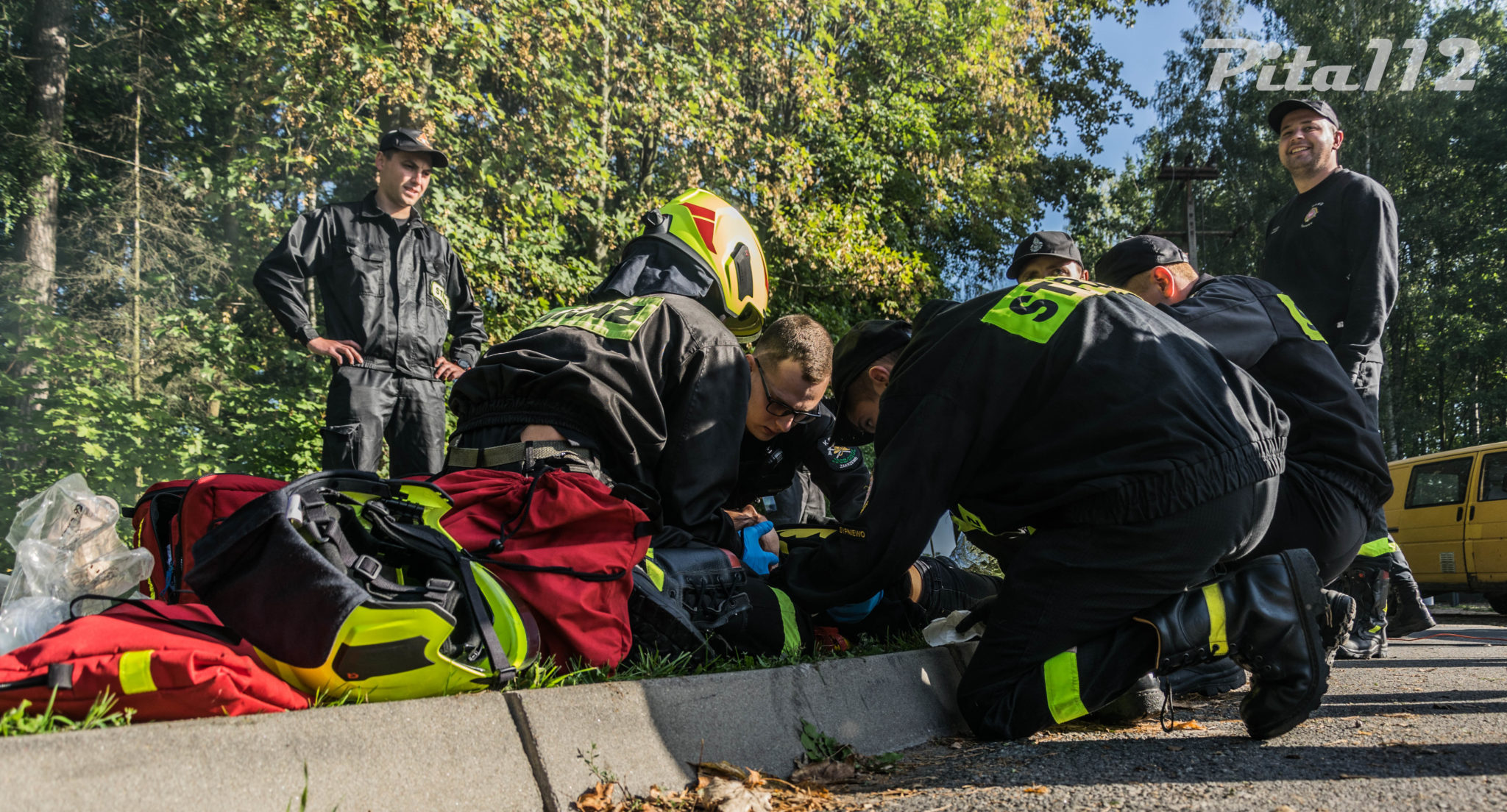 Scenka nr. 5 – Strażak w pełnym umundurowaniu wyciągnięty z pożaru, brak funkcji życiowych. Jak najszybsze wdrożenie RKO i rozebrania z ODO, maski, nomexu.