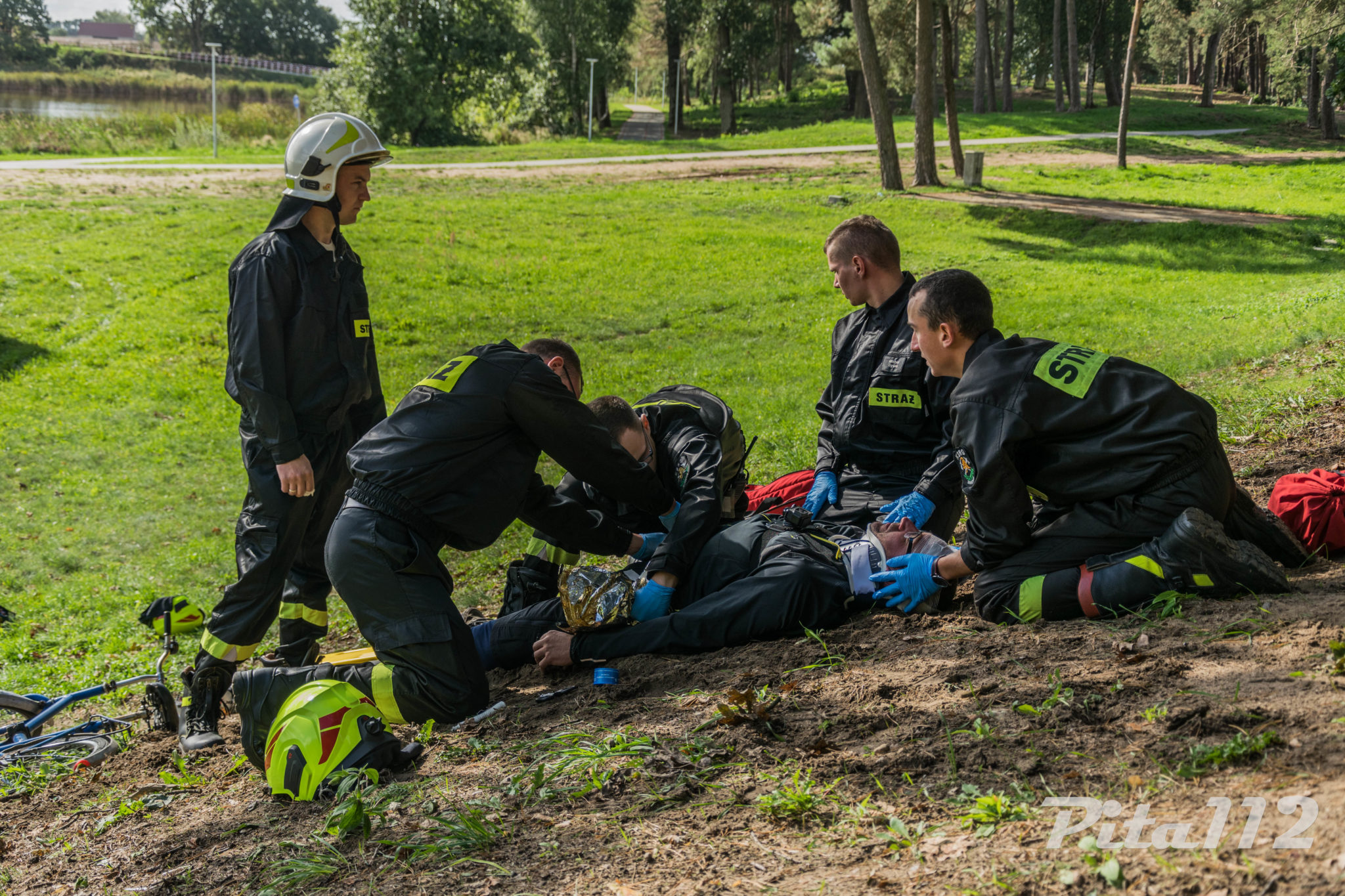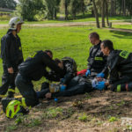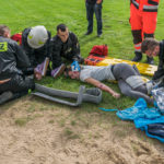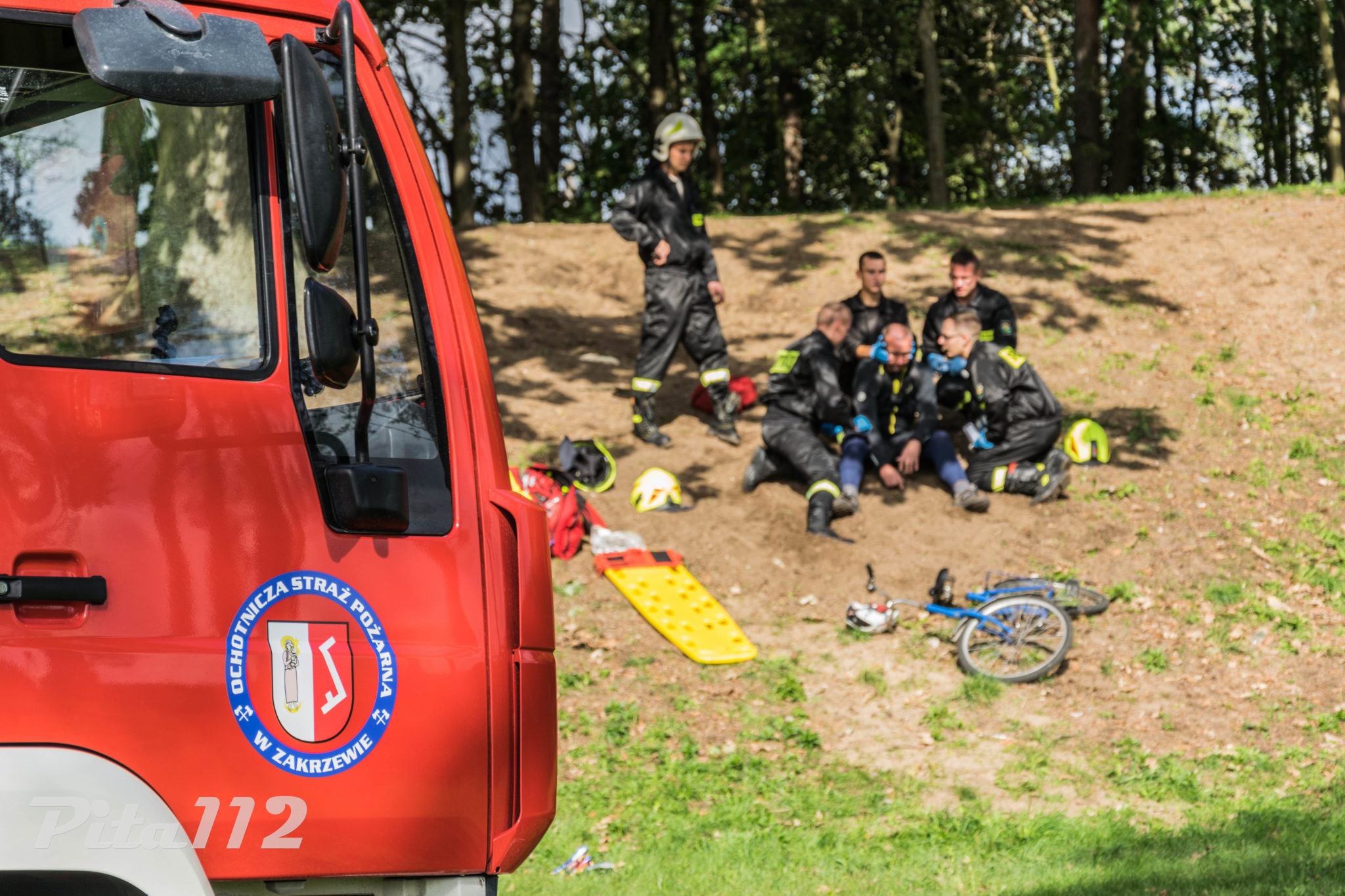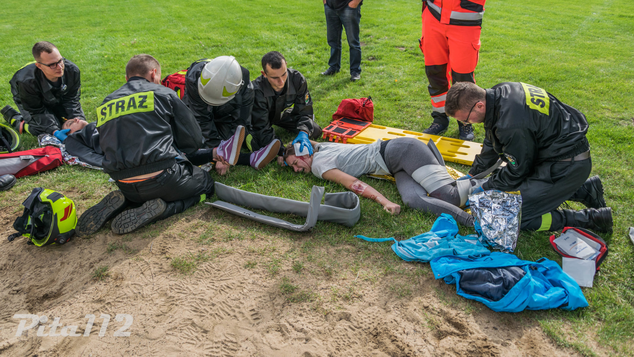 Scenka nr. 1 – Wypadek rowerzysty który trenował cross, został przy prędkości jadąc z górki wybity z roweru i upadł na miednice – połamana miednica i rana głowy. Opatrzenie urazu głowy i stabilizacja miednicy.