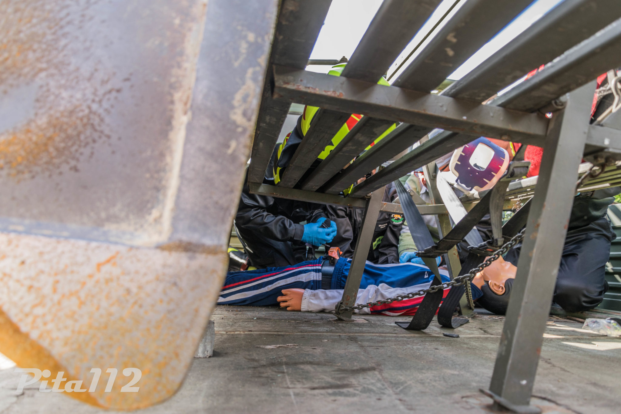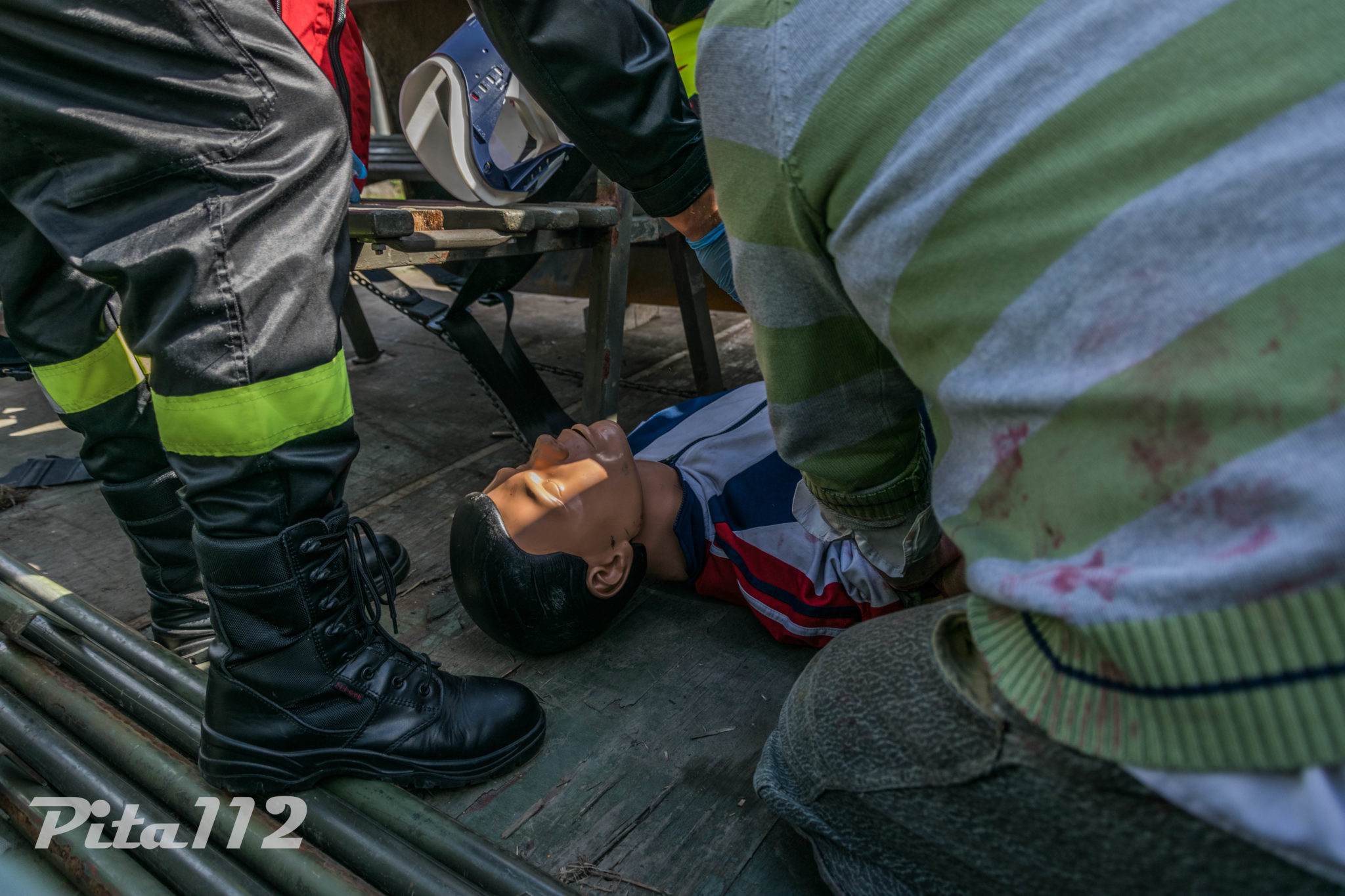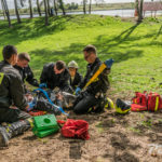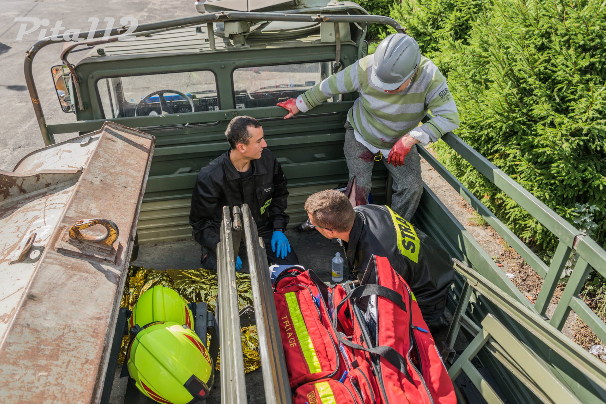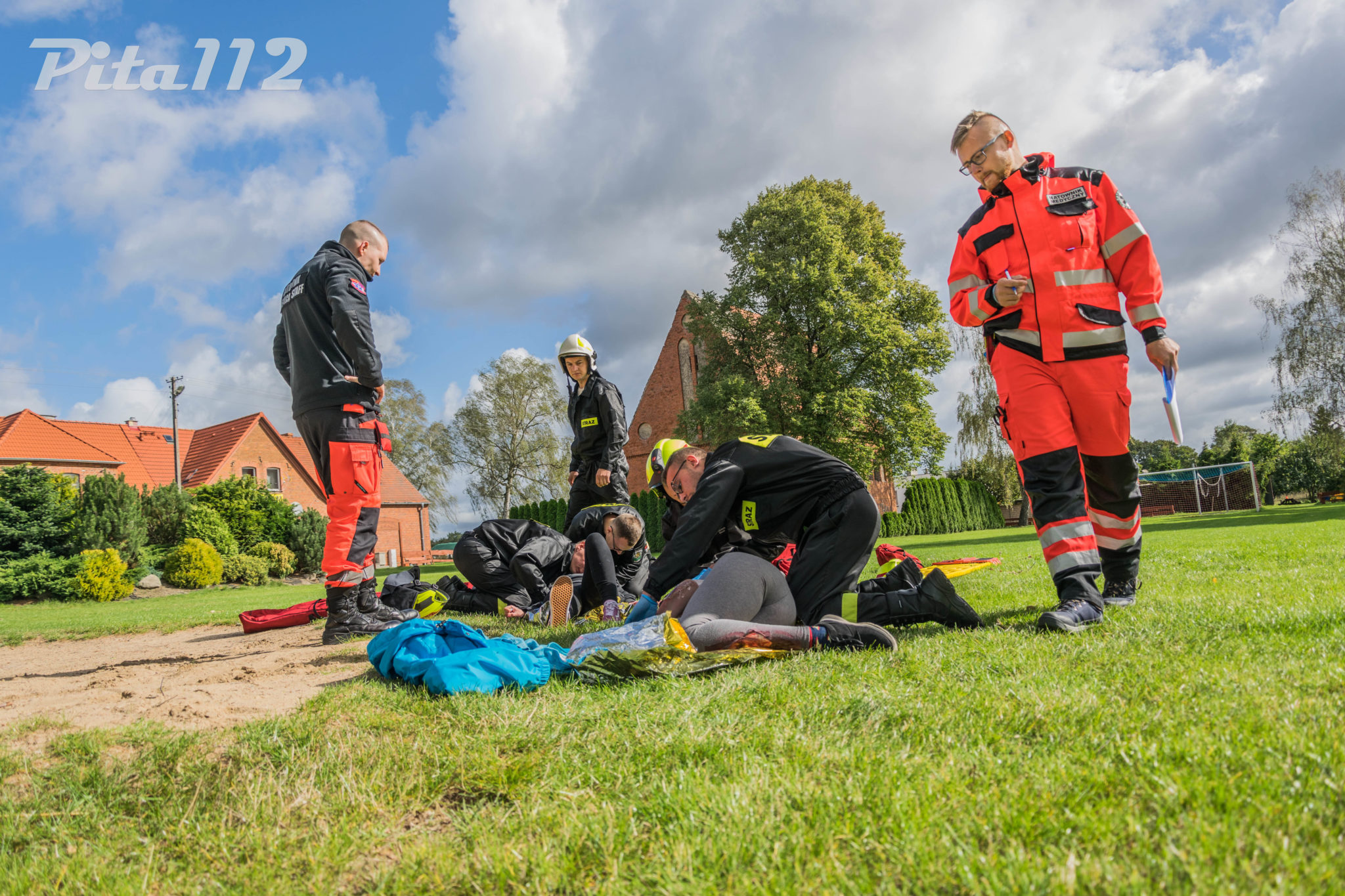 Scenka nr. 1 – Wypadek rowerzysty który trenował cross, został przy prędkości jadąc z górki wybity z roweru i upadł na miednice – połamana miednica i rana głowy. Opatrzenie urazu głowy i stabilizacja miednicy.