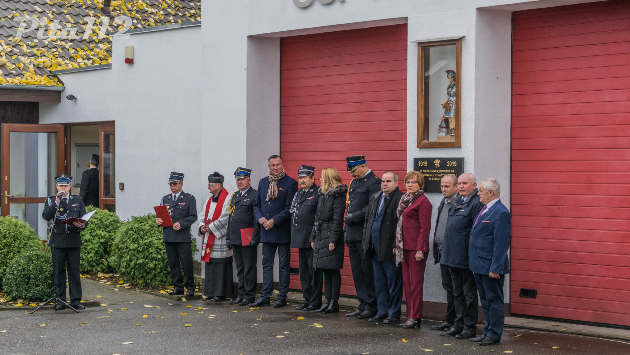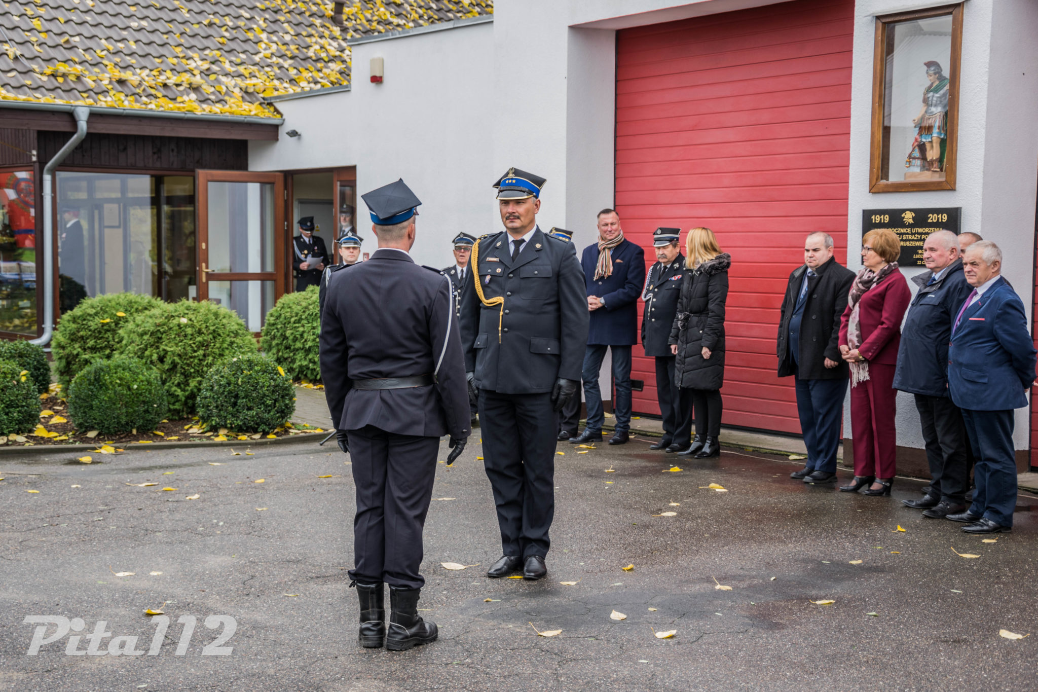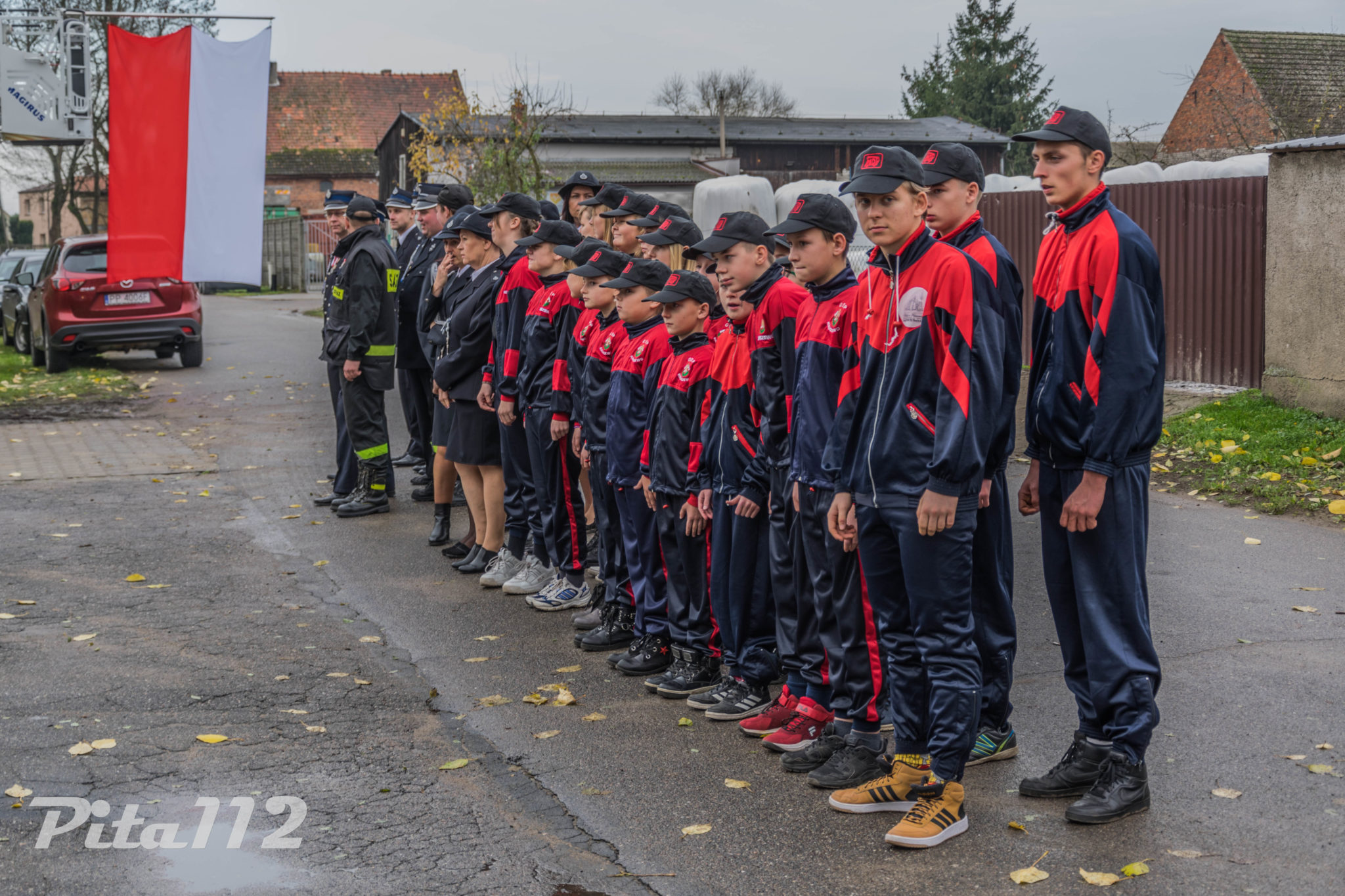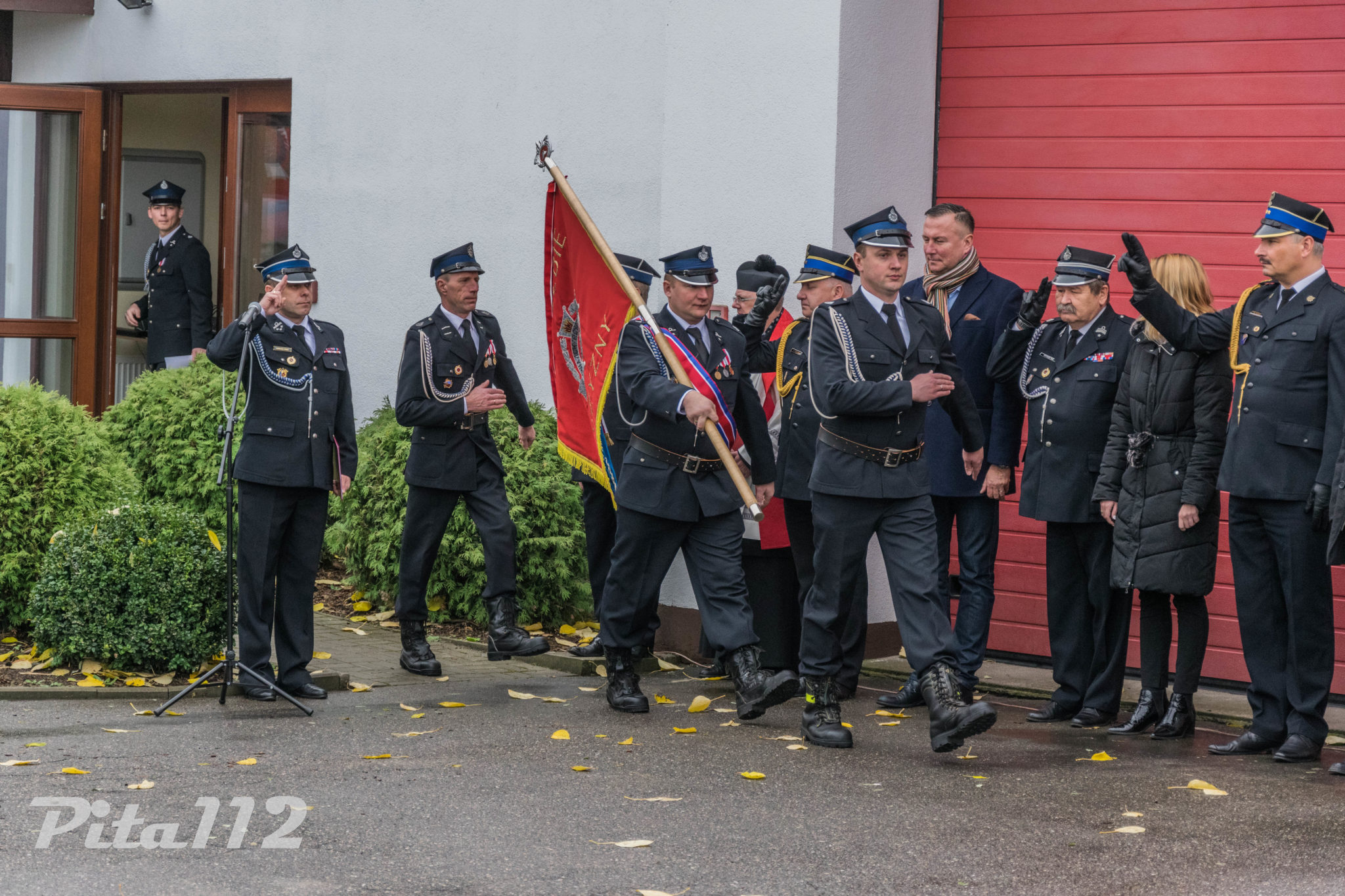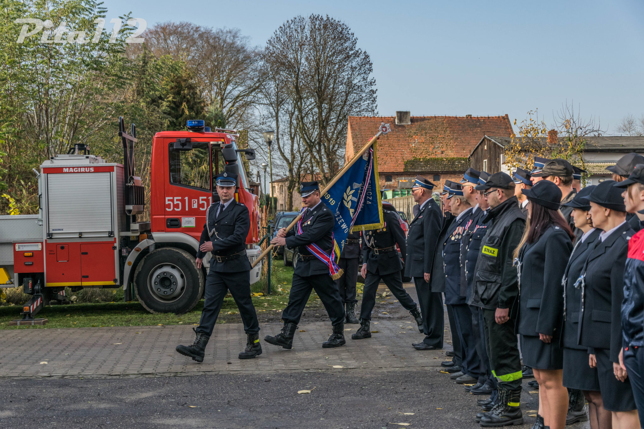 Na placu przed remizą odbyła się oficjalna cześć uroczystości. Po wprowadzeniu sztandaru, podniesieniu flagi państwowej oraz odśpiewaniu hymnu narodowego przystąpiono do powitania przybyłych gości.