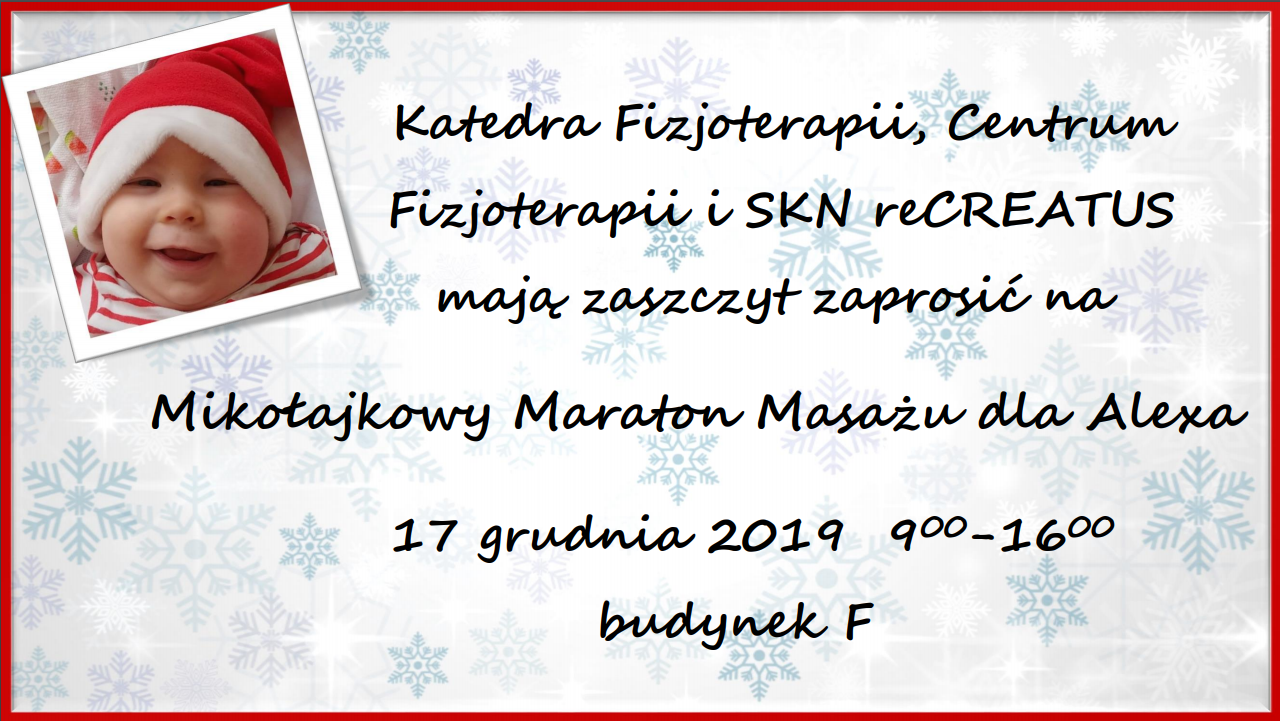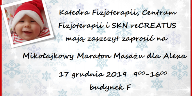 Każda osoba która zechce wziąć udział w maratonie po wrzuceniu dowolnej kwoty do puszki na leczenie Alexa będzie miała możliwość skorzystania z masażu oferowanego przez absolwentów/uczniów kierunku Fizjoterapia tej uczelni. Zapraszamy do wzięcia udziału w tym wspaniałym wydarzeniu !