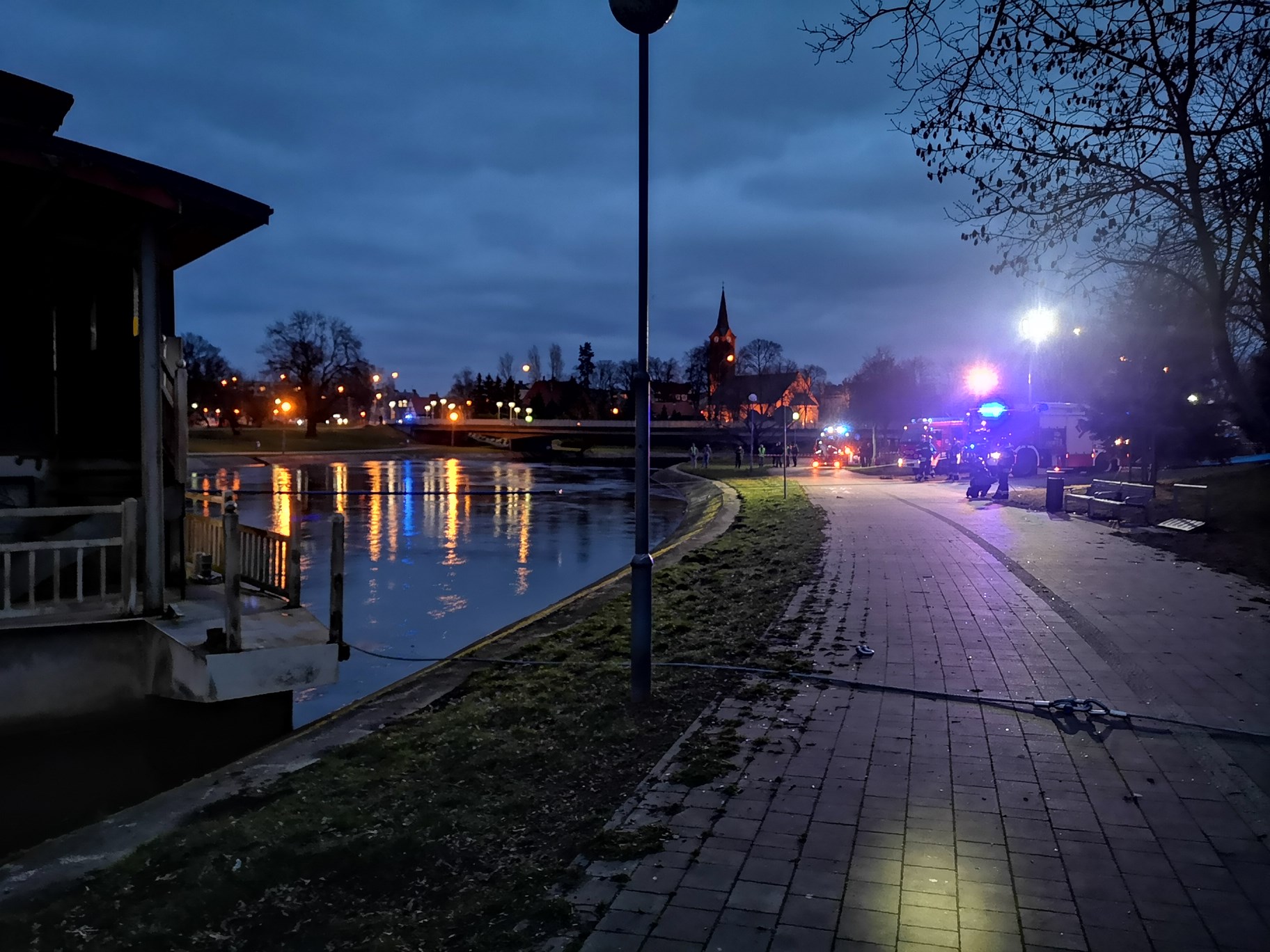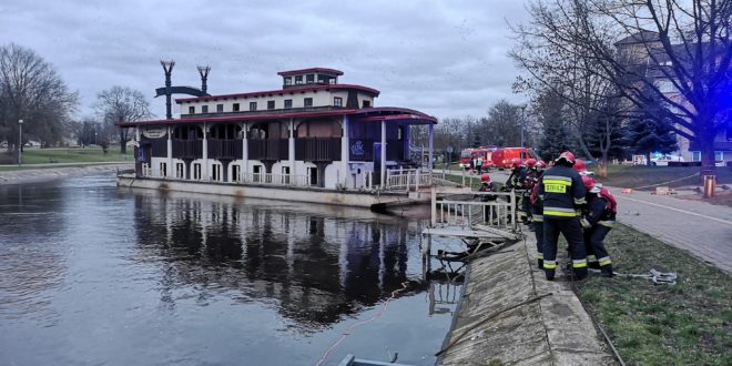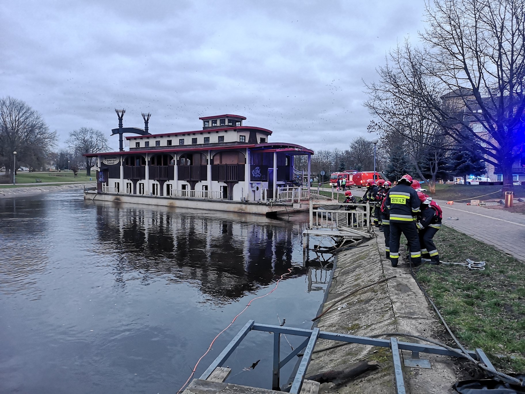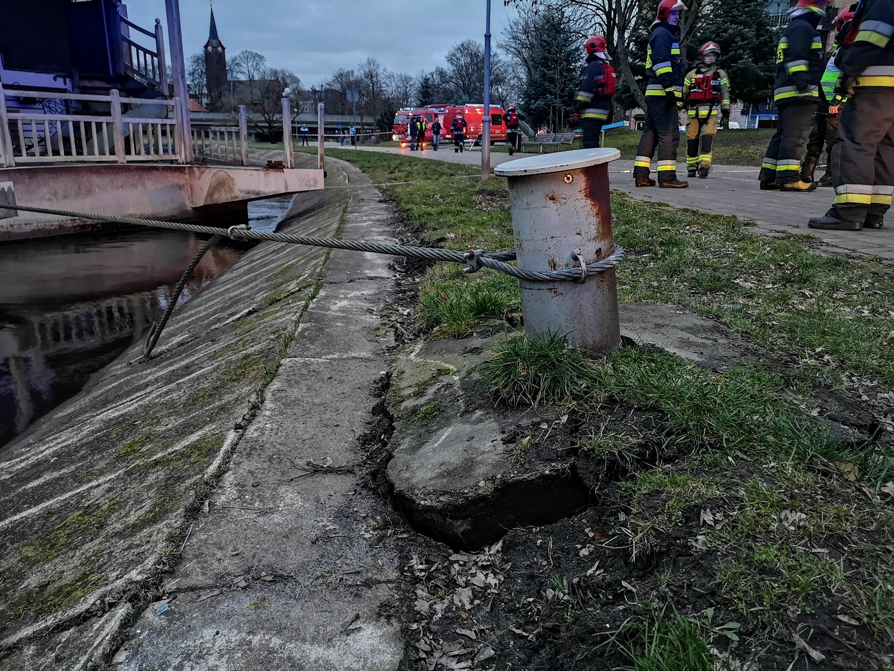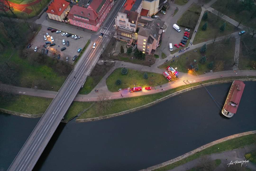 Po przybyciu na miejsce strażacy zastali jednostkę pływającą ustawioną w poprzek rzeki. Barka przycumowana była tylko w jednym punkcie do metalowego słupa, częściowo już wyrwanego.