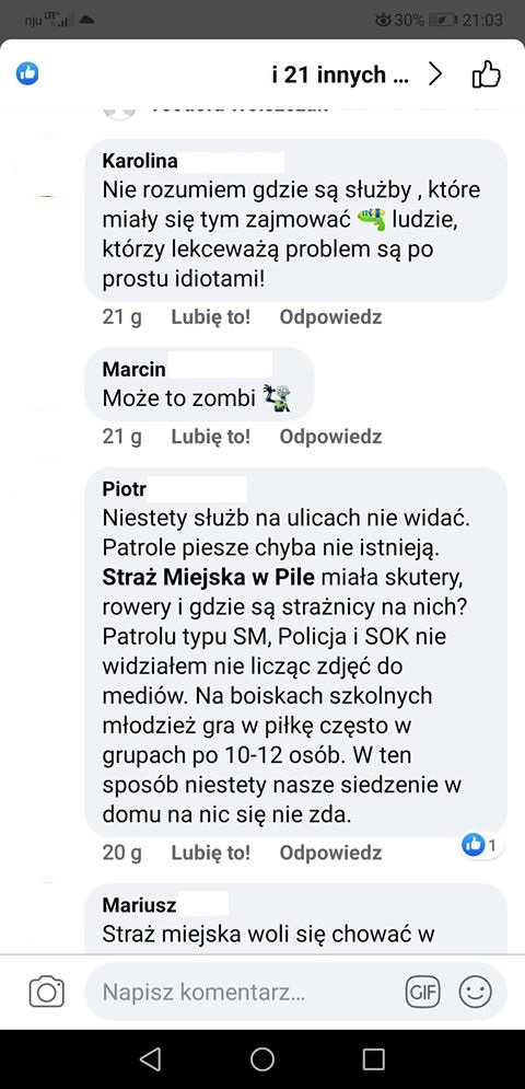 „Pomimo zamkniętych galerii, trwającym stanem zagrożenia epidemicznego starsi ludzie wychodzą tłumnie do marketów, banków, parków. Prośba od służb ale również w moim imieniu do tych młodszych by uświadamiali swoich rodziców, dziadków że to poważne zagrożenie. Po internecie krąży mem gdzie pod Kauflandem w Pile starsi ludzi aż się kotłują by wejść do środka. Myślę że rolą młodzieży jest by przekazać im jak powinny wyglądać wyjścia z domu jeżeli już to konieczne. Problem w tym, że zarazić się można od każdego bo ktoś może nie wiedzieć że jest nosicielem choroby. Problem się rozszerza i nawet ludzi młodzi zaczynają lekceważyć zalecenia. Co chwilę na portalach pojawiają się wpisy typu: „prosimy policjantów i strażników miejskich by ludzi wygonili z ulic”.