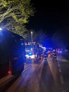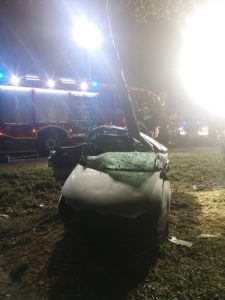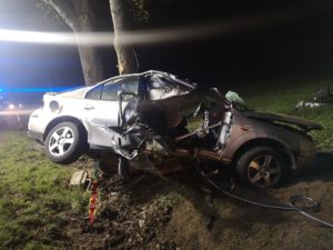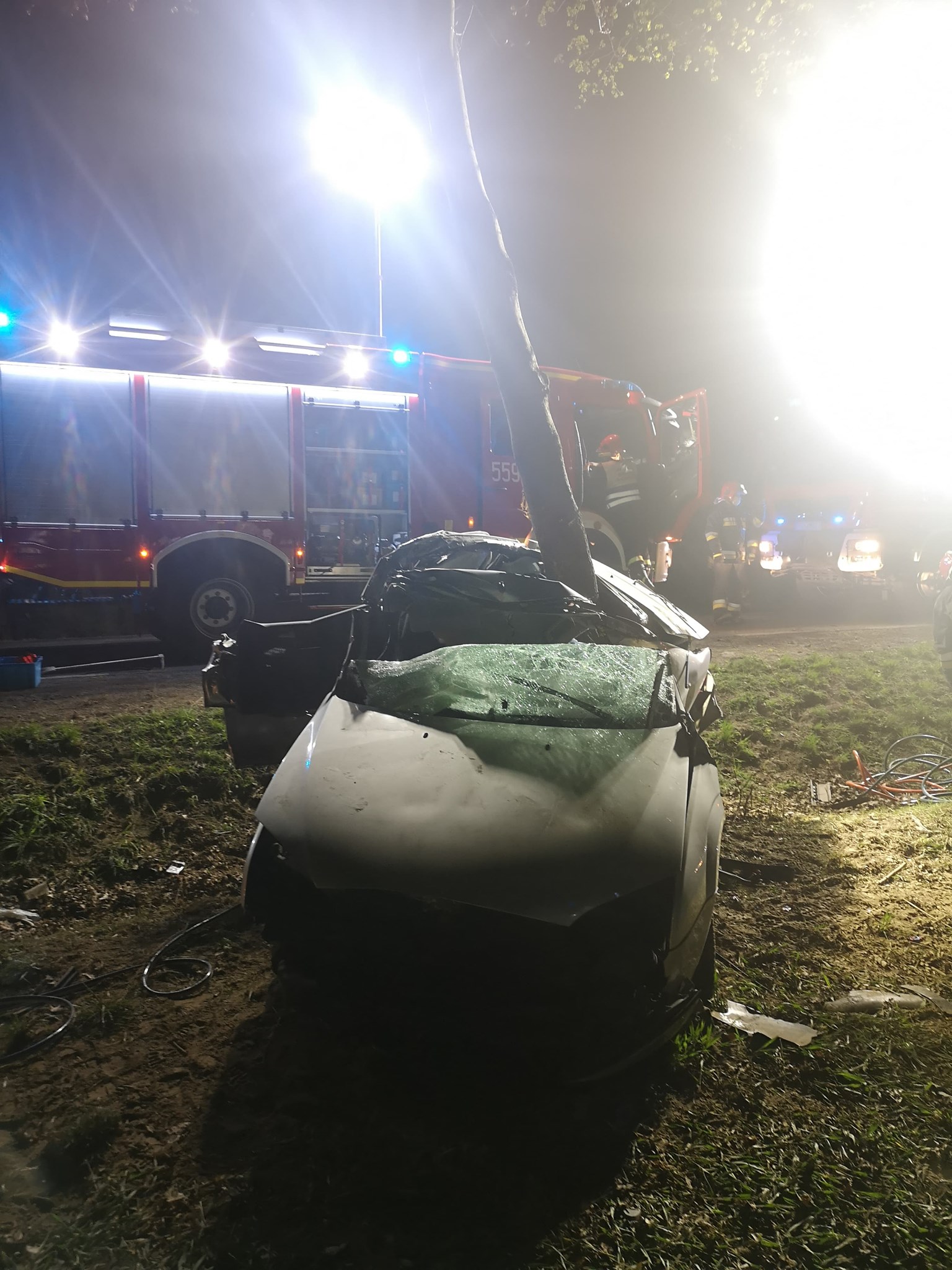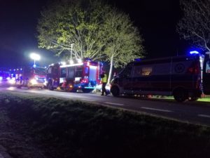 Po przyjeździe służb na miejsce zastano rozbity samochód który wypadł z jezdni i uderzył w drzewo. Podczas działań zabezpieczono miejsce zdarzenia, oświetlono teren działań, wykonano dostęp do uwięzionej pasażerki za pomocą sprzętu hydraulicznego, udzielono KPP poszkodowanemu kierowcy oraz kierowano ruchem.