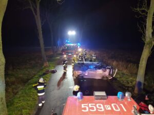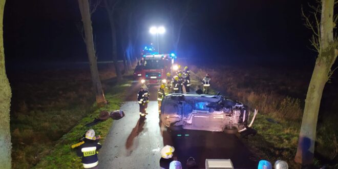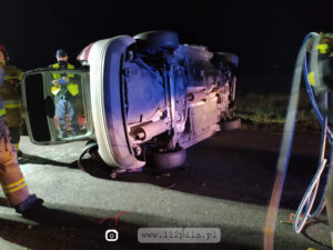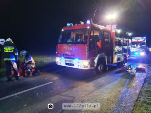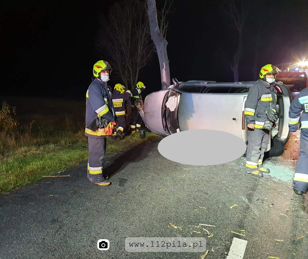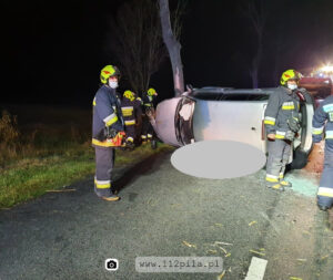 W dniu dzisiejszym 14.11.2020 około godziny 20:30 do SKKP PSP w Pile wpłynęło zgłoszenie o wypadku samochodu osobowego który w wyniku zdarzenia dachował.