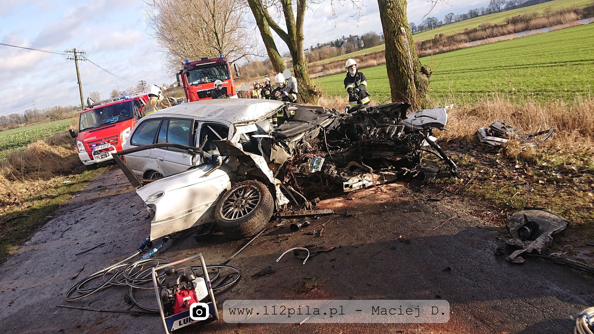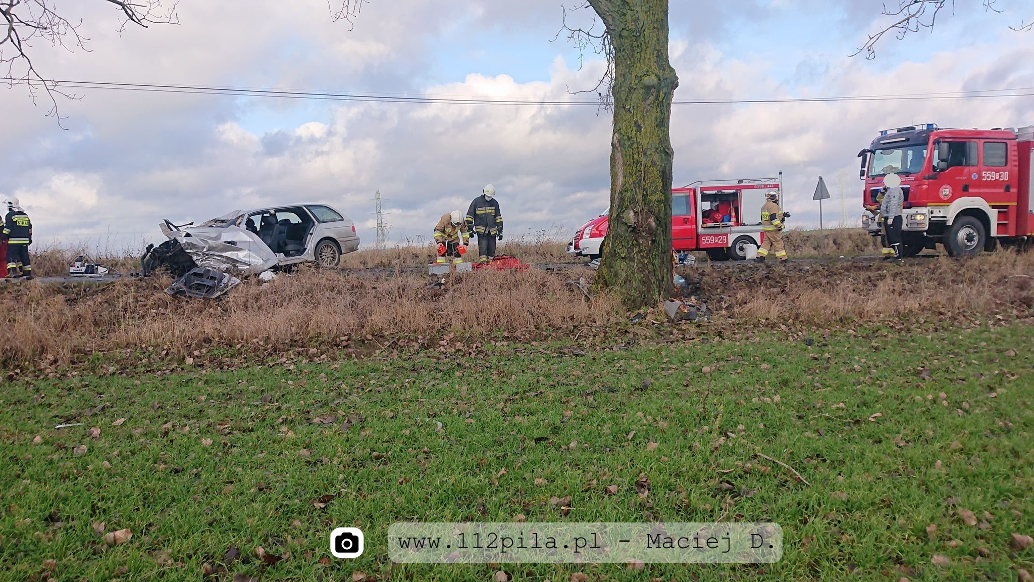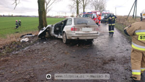 Po przyjeździe na miejsce pierwszych zastępów rozpoznano iż na prostym odcinku drogi pojazd uderzył w drzewo.