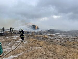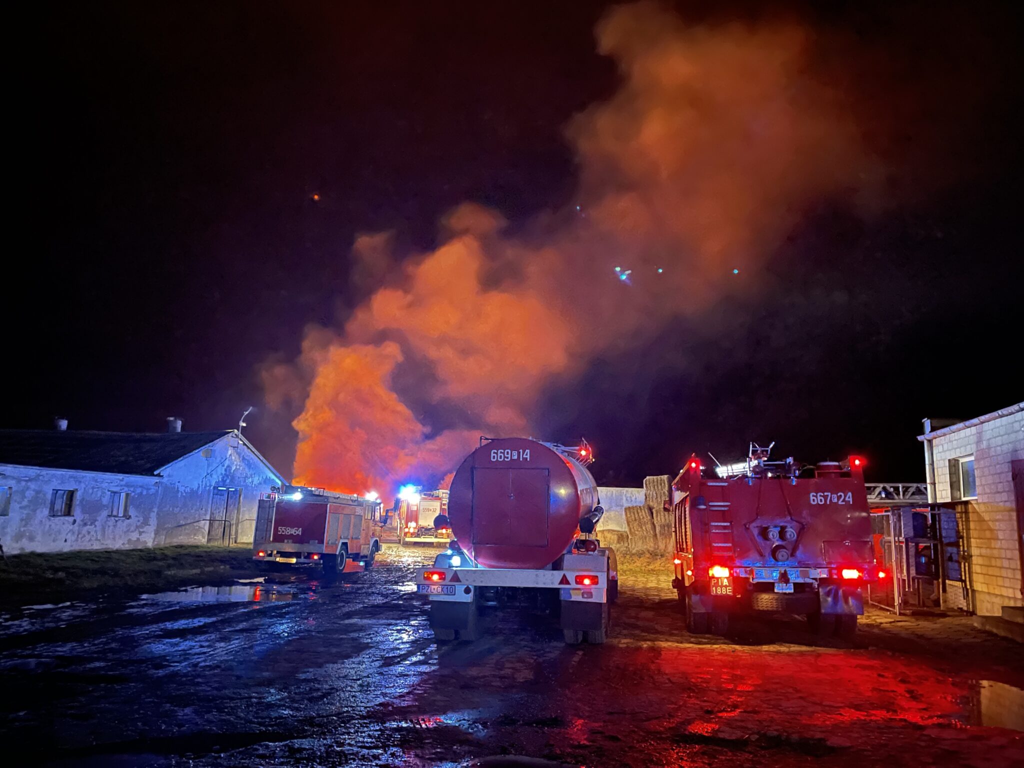Po przybyciu na miejsce zdarzenia pierwszych zastępów straży pożarnej, stwierdzono, że pożarem objęta jest w całości drewniana wolno stojąca stodoła, wypełniona słomą w balotach.