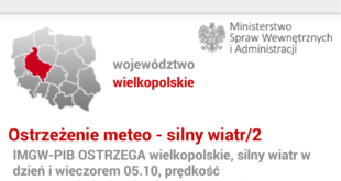 Instytut Meteorologi i Gospodarki Wodnej w Poznaniu ostrzega przed wystąpieniem silnych porywów wiatru II stopnia od 2017-10-05 15:00:00 do 2017-10-05 22:00:00 Prognozuje się wystąpienie silnego wiatru o średniej prędkości od 35 km/h do 50 km/h, z porywami do 115 km/h, południowo-zachodniego skręcającego na północno-zachodni. Na południu województwa istnieje ryzyko 30%, wystąpienia porywów ...